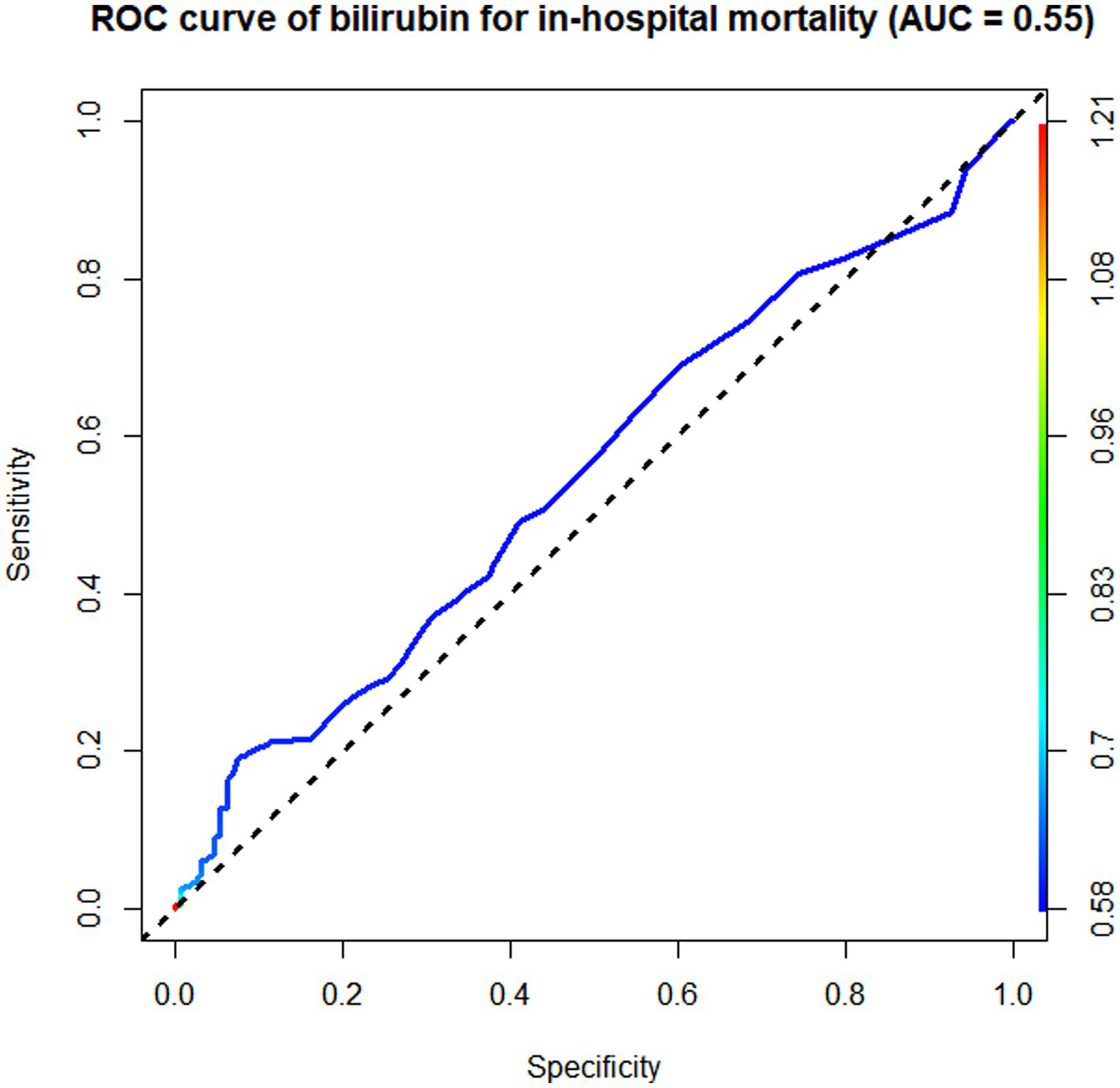 We adjusted the covariates of comorbidities and vital sign data, including age, sex, heart rate, mean blood pressure, SpO2, congestive heart failure, renal failure, and temperature, in Model I. Model II was mostly modified for laboratory data, including creatinine, anion gap, hemoglobin, prothrombin time, glucose, and chloride. Based on Model II, the variables were further modified for the severity of illness scoring (SOFA score, SAPS II). Through the receiver operating characteristic (ROC) curve analysis, the discriminative ability of the four inflammatory indicators (SII, NLR, PLR, and total bilirubin) for predicting in-hospital mortality in patients with AIS was determined using the area under the ROC curve (AUC). Discrimination was considered good if the AUC exceeded 0.7 and moderate if the AUC was between 0.65 and 0.70. Statistical information was displayed as hazard ratios (HRs) and 95% confidence intervals (CIs). Each statistical test was conducted using a two-tailed design. R version 4.2.2 was used for the statistical analysis, and a p value of ≤ 0.05 was considered statistically significant.