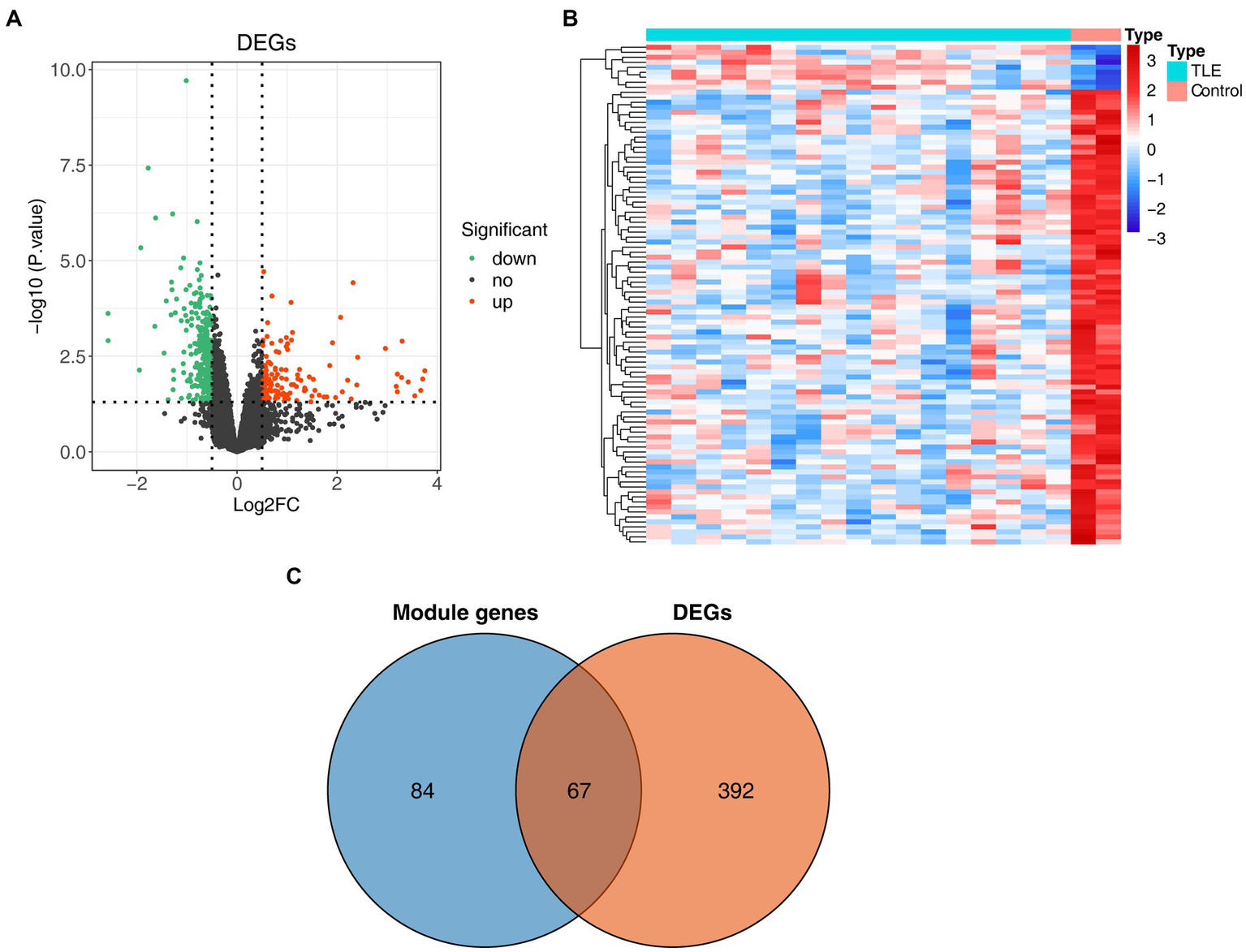 Identification of differentially expressed genes (DEGs) in TLE. (A) The volcano map of DEGs between normal and TLE samples. (B) The heatmap of top100 DEGs. (C) Venn diagram for TLE-related DEGs.