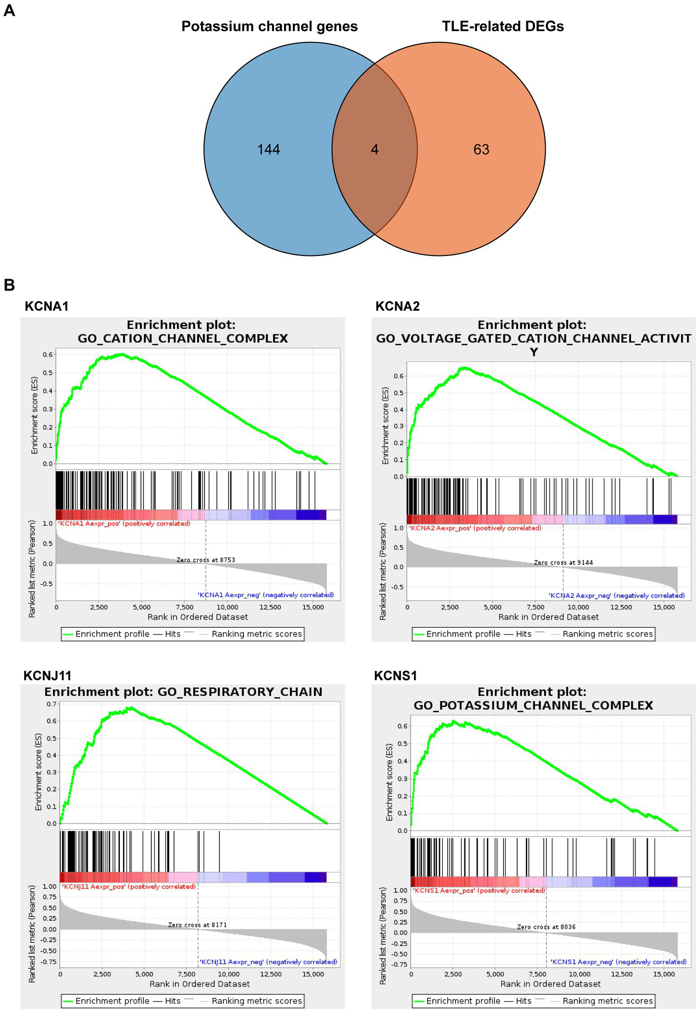 Identification and analysis of TLE-related key potassium channel genes (TERKPCGs). (A) Venn diagram for TERKPCGs. (B) Single-gene Gene set enrichment analysis (GSEA) of four TERKPCGs. (Top) Enrichment score (ES) line chart: the display of the ES value as it is calculated to each position when the analysis is sorted along the ranking list. The score at the highest peak (the farthest vertical distance) is the ES value of the gene set. (Middle) Lines are used to mark the position of members from the gene set in the gene sorting list, and the black line represents that the genes from the sorting gene table exist in the functional annotation gene set of the current analysis. Leading edge subset is the corresponding gene from (0,0) to the highest peak ES. (Bottom) After sorting, the rank values of all genes were distributed. The genes corresponding to the red part of the heat map were highly positively correlated to the TERKPCG, and the genes corresponding to the blue part were highly negatively correlated to the TERKPCG. The pearson correlation coefficient of each gene was displayed in a gray area map.