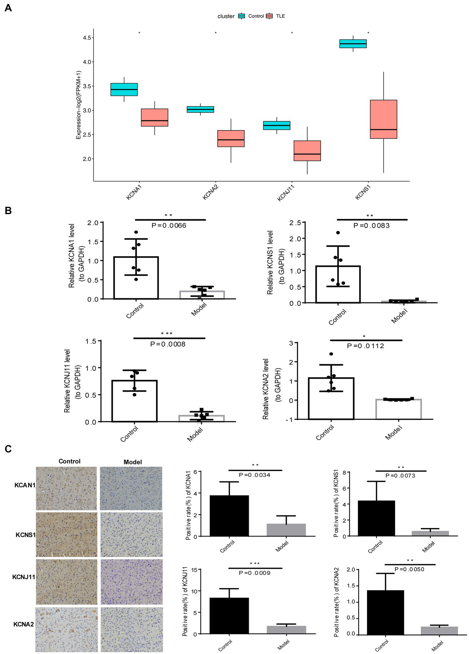 Next, we downloaded 148 potassium channel-related genes from MsigDB (Supplementary Table S5) and selected the intersection with 67 TLE-related DEGs to obtain the TLE-related key potassium channel genes, where KCNA1, KCNA2, KCNJ11, and KCNS1 were selected as TERKPCGs (Figure 3A). A PPI network was constructed to analyze the interrelationship between TERKPCGs and other key module genes (Supplementary Figure S1).