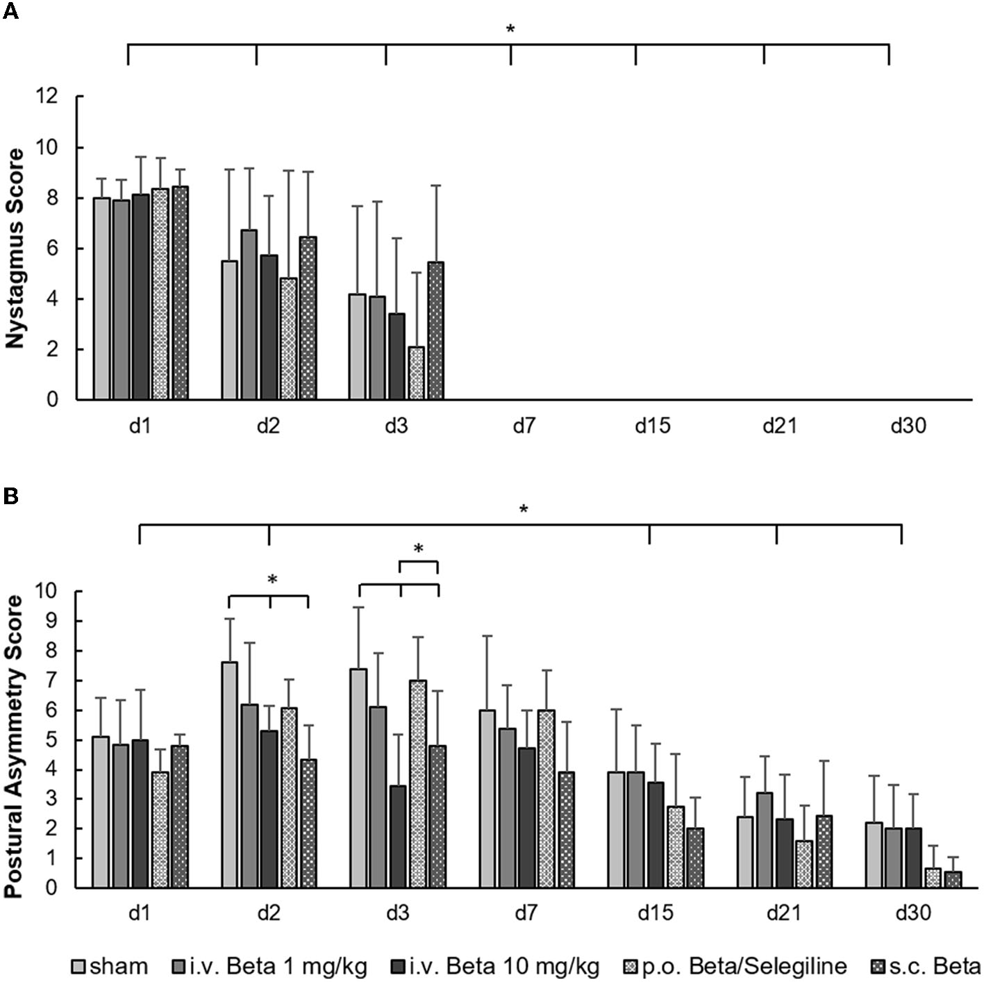 Clinical scoring of nystagmus and postural asymmetry post-UL. (A) The nystagmus decreased steadily and disappeared by day 7 post-UL in all groups without a significant effect of either dose or route of betahistine treatment. (B) The postural asymmetry scores were significantly improved in the i.v. high-dose betahistine group and the s.c. betahistine osmotic pump group on days 2 and 3 post-UL compared to the sham treatment group. The p.o. betahistine/selegiline group and s.c. betahistine group showed a tendency to lower postural asymmetry on day 30 post-UL (p = 0.06). The i.v. low-dose betahistine treatment had no effect on postural scores at any time point. Beta, betahistine; d, day. *p < 0.05, error bars represent +/– SD.