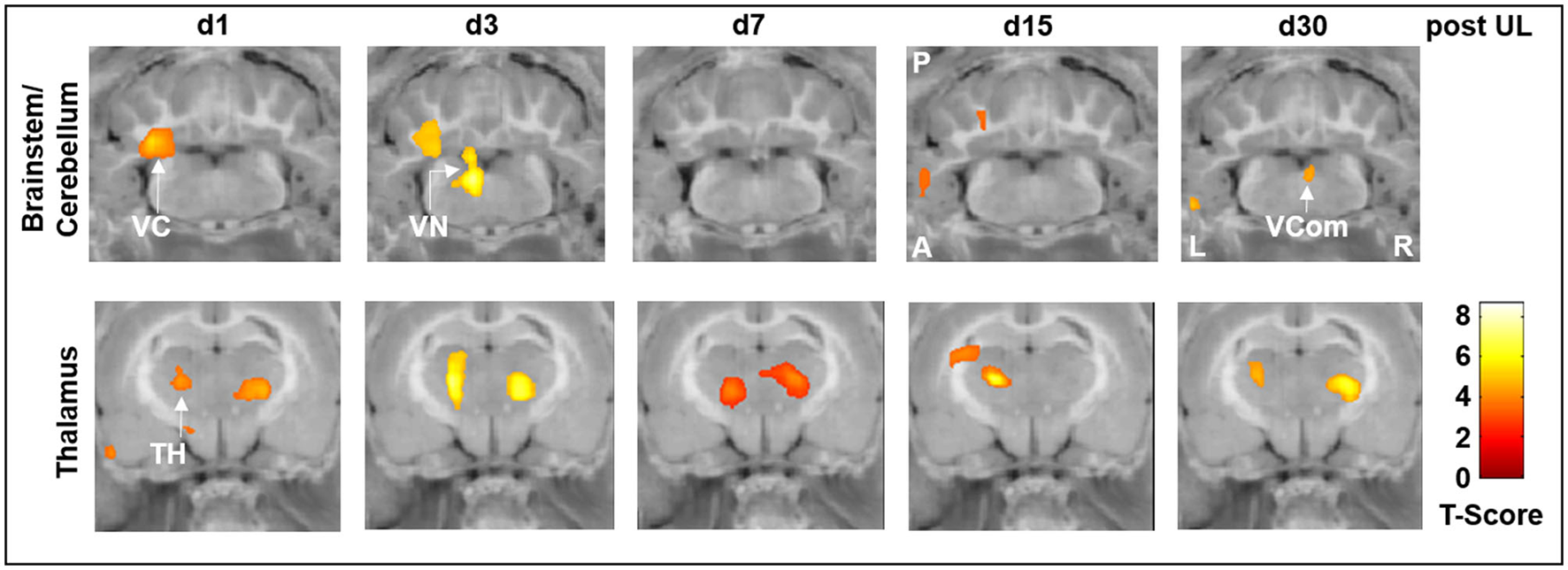 Specifically, rCGM in the i.v. high-dose betahistine group was significantly increased in the ipsilesional vestibular nucleus on day 3 and the ipsilesional vestibulocerebellum on days 1 and 3 post-UL, compared to the sham treatment group (Figure 3, top row). Increased activation in the ipsilesional vestibulocerebellum (flocculus) on days 15 and 30 post-UL, as well as in the vestibular commissure on day 30 post-UL, was shown in the i.v. high-dose betahistine group. In the thalamus, rCGM increased on days 1, 3, 7, 15, and 30 post-UL following i.v. high-dose betahistine treatment (Figure 3, bottom row).