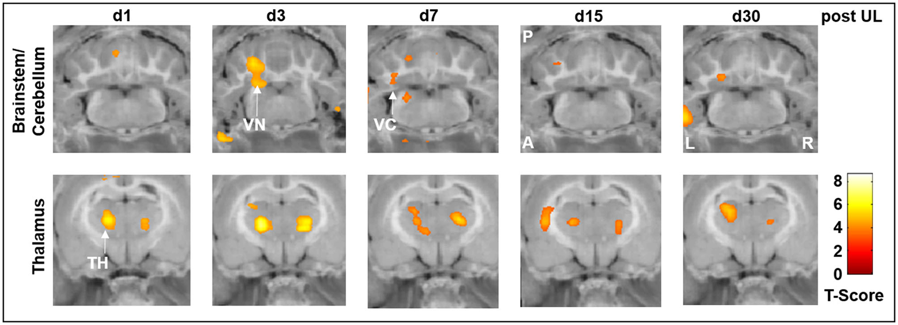 [18F]-FDG uptake of the i.v. high-dose betahistine group compared to the sham treatment group. In brainstem–cerebellar networks, the i.v. high-dose betahistine group showed a significant increase in [18F]-FDG uptake in the ipsilesional vestibular nucleus (max. day 3 post-UL) and vestibulocerebellum compared to the sham treatment group. In the thalamus, the i.v. high-dose betahistine group had a bilaterally increased [18F]-FDG uptake compared to the sham treatment group from day 1 to 30 post-UL. TH, thalamus; UL, unilateral labyrinthectomy; VC, vestibulocerebellum; VCom, vestibular commissure; VN, vestibular nucleus; A, anterior; P, posterior; L, left; R, right; [18F]-FDG, [18F]-fluorodeoxyglucose.