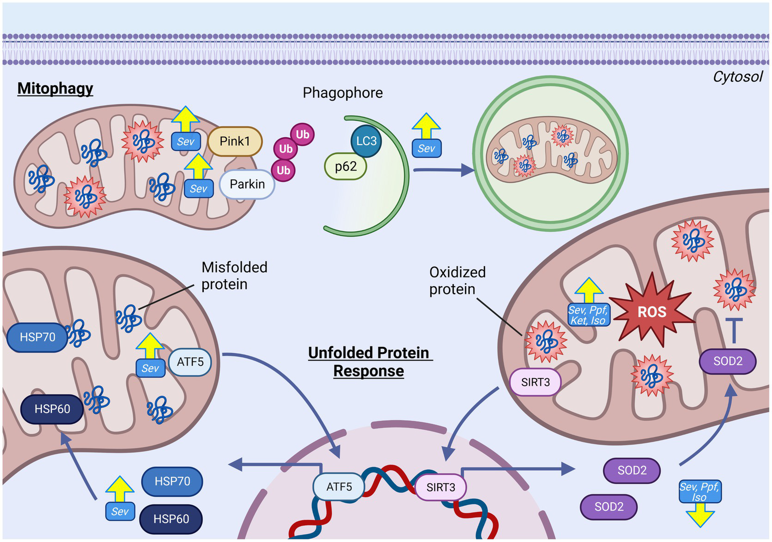 GAs alter mitochondrial quality control pathways in the developing brain. GAs have been shown to increase abundance of prominent regulators in proteostatic mtUPR pathways responsible for mitigating both protein misfolding and oxidative stress including HSP60, ATF5 and HSP70. Despite evidence of increased oxidative stress and mitochondrial ROS, reduced expression of antioxidant enzyme SOD2 has been commonly observed. Indicators of increased mitophgy activation including elevated levels of PINK, Parkin, LC3, and reduced p62, indicating increased removal of damaged mitochondria following GA exposure. Yellow arrows indicate experimentally observed changes, dotted red arrows and red boxes represent proposed mechanisms of GA neurotoxic action. Reactive oxygen species (ROS), Superoxide dismutase 2 (SOD2), Caseinolytic mitochondrial matrix peptidase proteolytic subunit (ClpP), Isoflurane (Iso), Propofol (Ppf), Sevoflurane (Sev), Ketamine (Ket), Mitochondrial unfolded protein response (mtUPR), Heat shock protein 60 (HSP60), Heat shock protein 70 (HSP70), Activating transcription factor 5 (ATF5), PTEN-induced kinase-1(PINK), Microtubule-associated protein 1A/1B-light chain 3 (LC3), Ubiquitin (Ub), Sequesterome (p62), Sirtuin 3 (SIRT3). Created with BioRender.com.