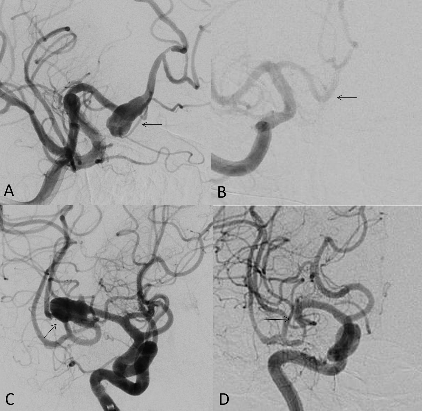 (A) 49-year-old male, unruptured aneurysm of the right anterior cerebral artery (arrow); (B) the 7 months control angiogram after PED treatment showed that the aneurysm was completely occluded (arrow); (C) 53-year-old female, the right middle cerebral artery bifurcation aneurysm (arrow); (D) the control angiogram after 9 months showed that the aneurysm was completely occluded (arrow).