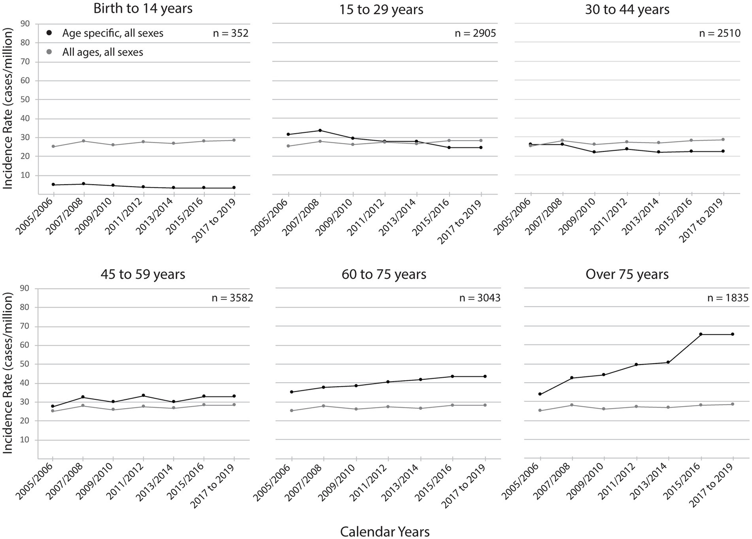 Figure 5. Estimated national TSCI discharge incidence rates, by age group and year. Age-specific discharge incidence rates are shown by cases per million of the age-specific population. The black line represents each age group-specific incidence rates and the gray line represents the incidence rates for all ages as a reference. The 2017 to 2019 age-specific rates were set to 2015 to 2016 rates since that was the most recent year of health administrative data available. The estimated case numbers corresponding to the incidence rates are shown in each panel to provide a context of the estimated case load volume over the 15 calendar years.