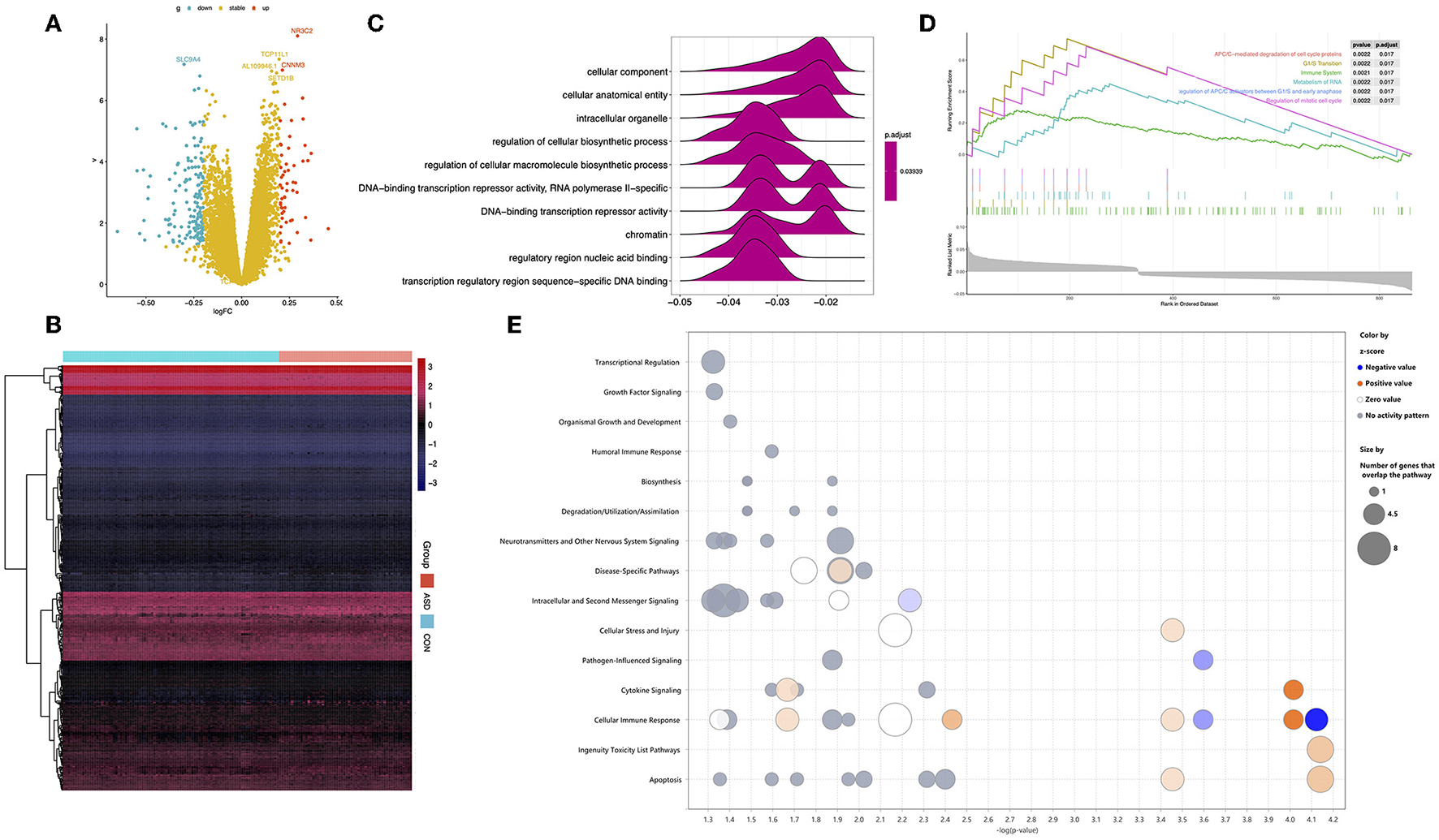 We identified 1,027 DEGs between 128 ASD and 126 CON participants based on the pre-processing expression data (Figures 2A, B). GO analysis was performed to identify the function of these DEGs; regulatory region nucleic acid binding and transcription regulatory region sequence-specific DNA binding were identified as the main molecular functions. Furthermore, the results of GSEA indicated that the main function of DEGs was APC-mediated degradation of cell cycle proteins, the immune system, and so on (Figures 2C, D). We also analyzed the canonical pathways of DEGs through IPA and found that the functions of the DEGs are enriched in immune-related signaling pathways such as cellular immune response and cytokine signaling. In addition, growth-related signaling pathways, neurotransmitter pathways, and other nervous signaling pathways were identified (Figure 2E).