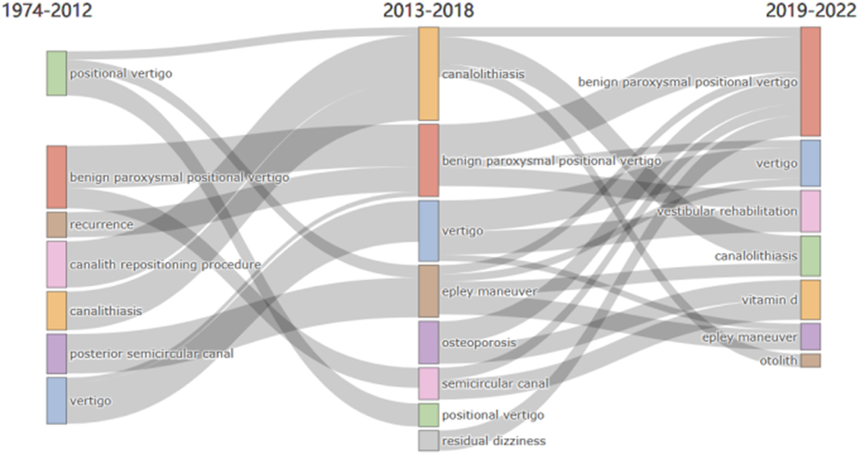 A bibliometric approach was used to collect 1,219 eligible studies on BPPV from four databases—PubMed, Embase, Scopus, and Web of Science—published between 1974 and 2022. The characteristics and status of the accumulated scientific output were processed using R and VOSviewer so that we could visualize any trends or hotspots.