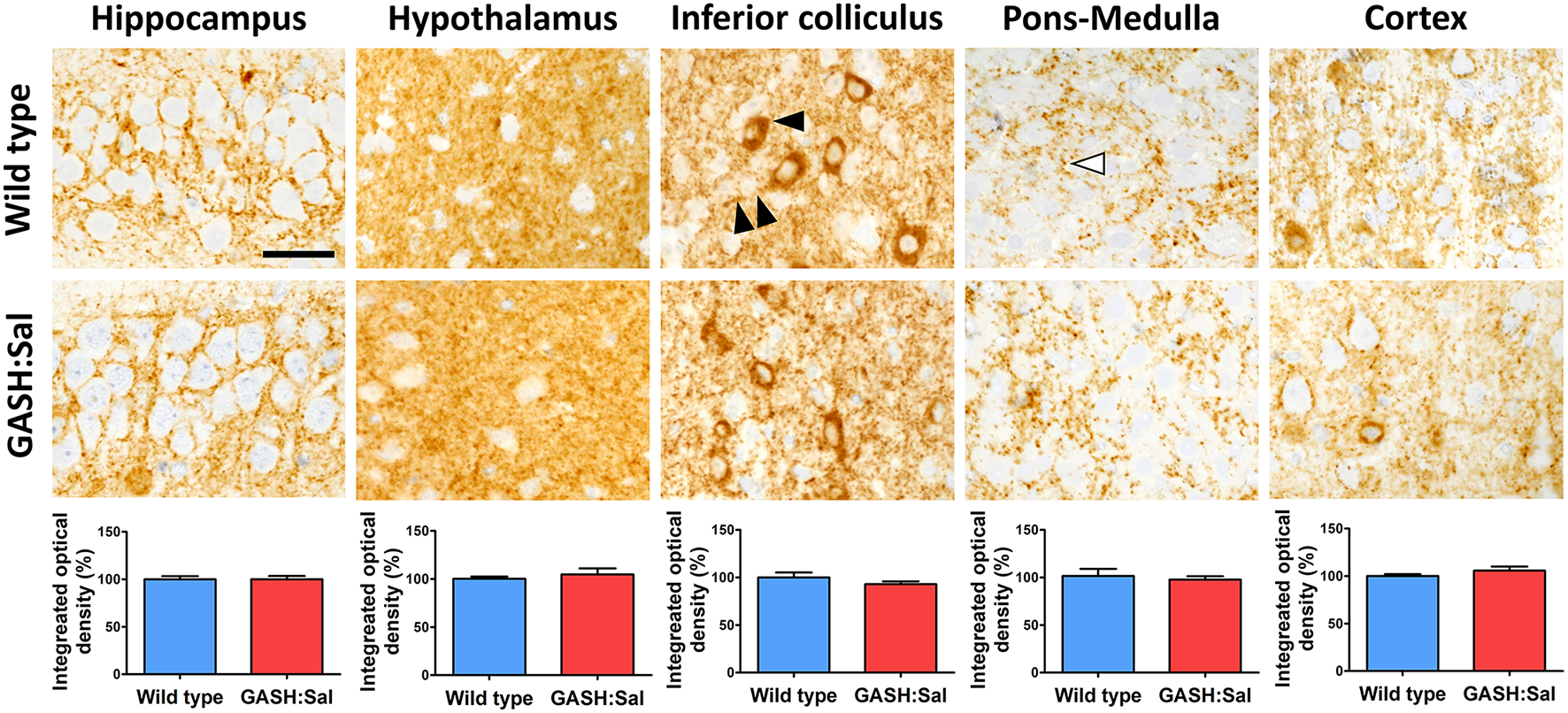 Brain GAD67 immunoreactivity in GASH/Sal epileptic hamsters. GAD67 immunostaining was evaluated in several brain regions of 3 epileptic GASH/Sal hamsters and compared to 3 wild-type controls. Microscopy images were obtained from paraffin-embedded brain sections containing hippocampus, hypothalamus, inferior colliculus, pons-medulla oblongata and cortex. The immunohistochemistry technique employed was the avidin–biotin-peroxidase complex method with 3′ 3-diaminobenzidine chromogen. Immunostaining was found in neurites (double arrowhead), somas of neurons (black arrowhead), and small puncta (white arrowhead). Scale bar, 25 μm. The graphs illustrate the integrated optical density as a measure of the extent and intensity of GAD67 immunostaining in each of the analyzed brain regions. Values are expressed as percentage of the immunoreactivity in wild-type hamsters. A t-test was used for statistical analysis. The pattern of GAD67 immunoreactivity in GASH/Sal hamsters is similar to that of wild-type controls.