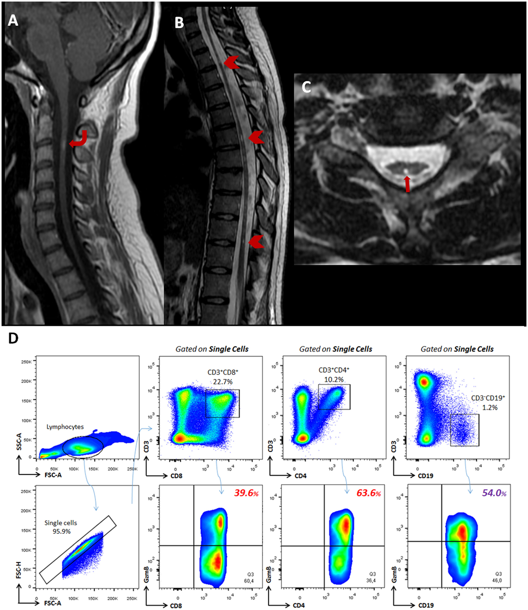 Imaging and profile of cytotoxic T- and B- subsets from a patient with AQP4-positive NMOSD. MR images of the cervical and thoracic spine demonstrate spinal cord involvement. (A) A sagittal contrast-enhanced T1-weighted image of the cervical spine shows a focal enhancing lesion at the C2-3 level (curved arrow). (B) The sagittal T2-weighted image shows diffuse thoracolumbar spinal cord atrophy and some multiple short segments of hyperintensity (arrowhead) along the spinal cord. This pattern may be present in chronic phases, and lesions tend to fragment into shorter segments after high-dose steroids or during remission. (C) The axial T2-weighted image shows a bright spotty lesion located centrally at the T2 level (arrow) and also demonstrates spine cord atrophy. (D) Flow cytometry analyses show percentages of CD8+GzmB+ (39.6%) and CD4+GzmB+ (63.6%) T lymphocytes beyond CD19+GzmB+ B cells (54.0%) identified in the peripheral blood.