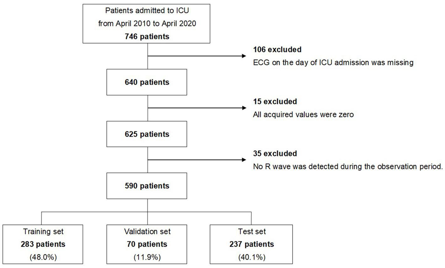Between April 2010 and April 2020, 746 patients were admitted to the ICU of the Hokkaido University Hospital for OHCA. Of these, we excluded 106 patients whose monitored ECGs were not obtained on the day of admission, 15 patients whose monitored ECG values were all zero, and 35 patients whose R waves were not observed in the early stage of admission to the ICU. A total of 590 patients were finally analyzed. The extraction flow of the target patients is shown in Figure 1, and the characteristics of the patients are shown in Table 1.