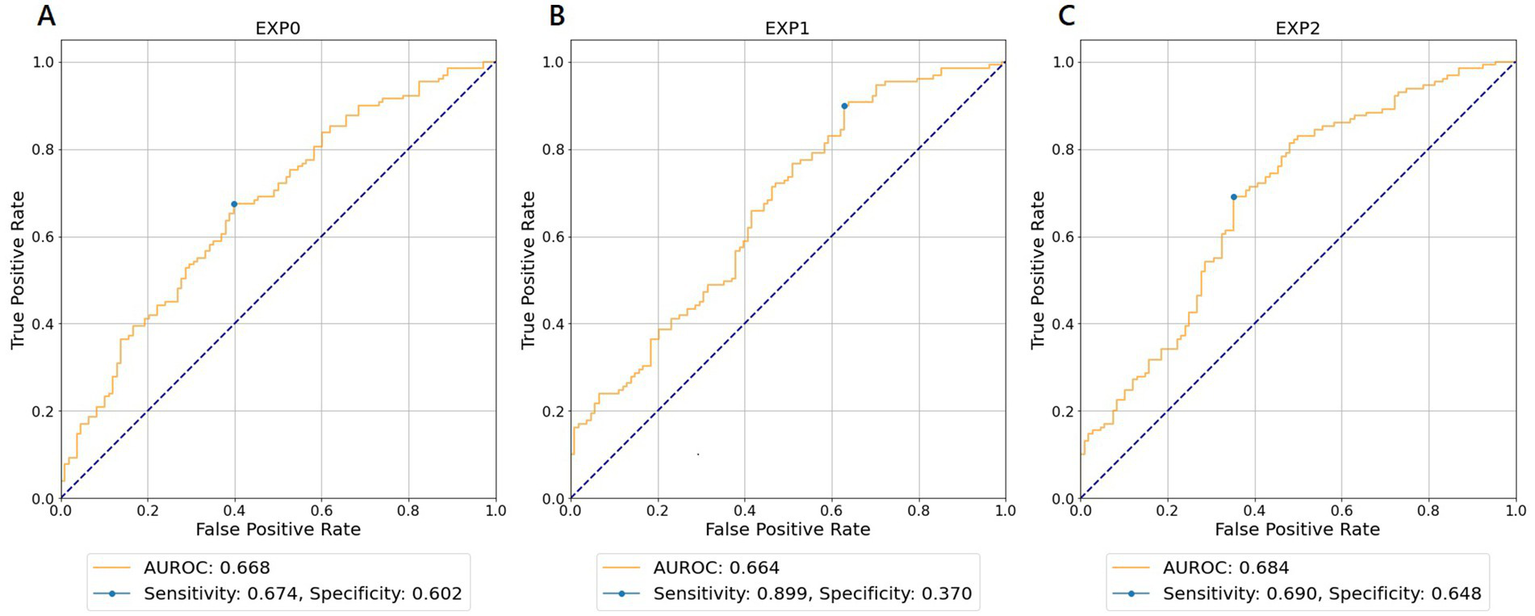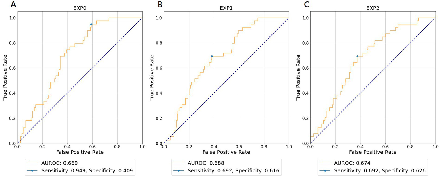 Receiver operating characteristic curves for wave number of 5 predicting favorable neurological outcomes. (A) EXP0 (MD-ECG data and HALF-ENTRY). (B) EXP1 (MD-ECG-ALLST data and HALF-ENTRY). (C) EXP2 (MD-ECG-ALLST data and MAX-ENTRY). EXP, experiment; AUROC, area under the receiver operating characteristic curve; MD-ECG, monitored ECG; ALLST, ALL-STATEMENTS.