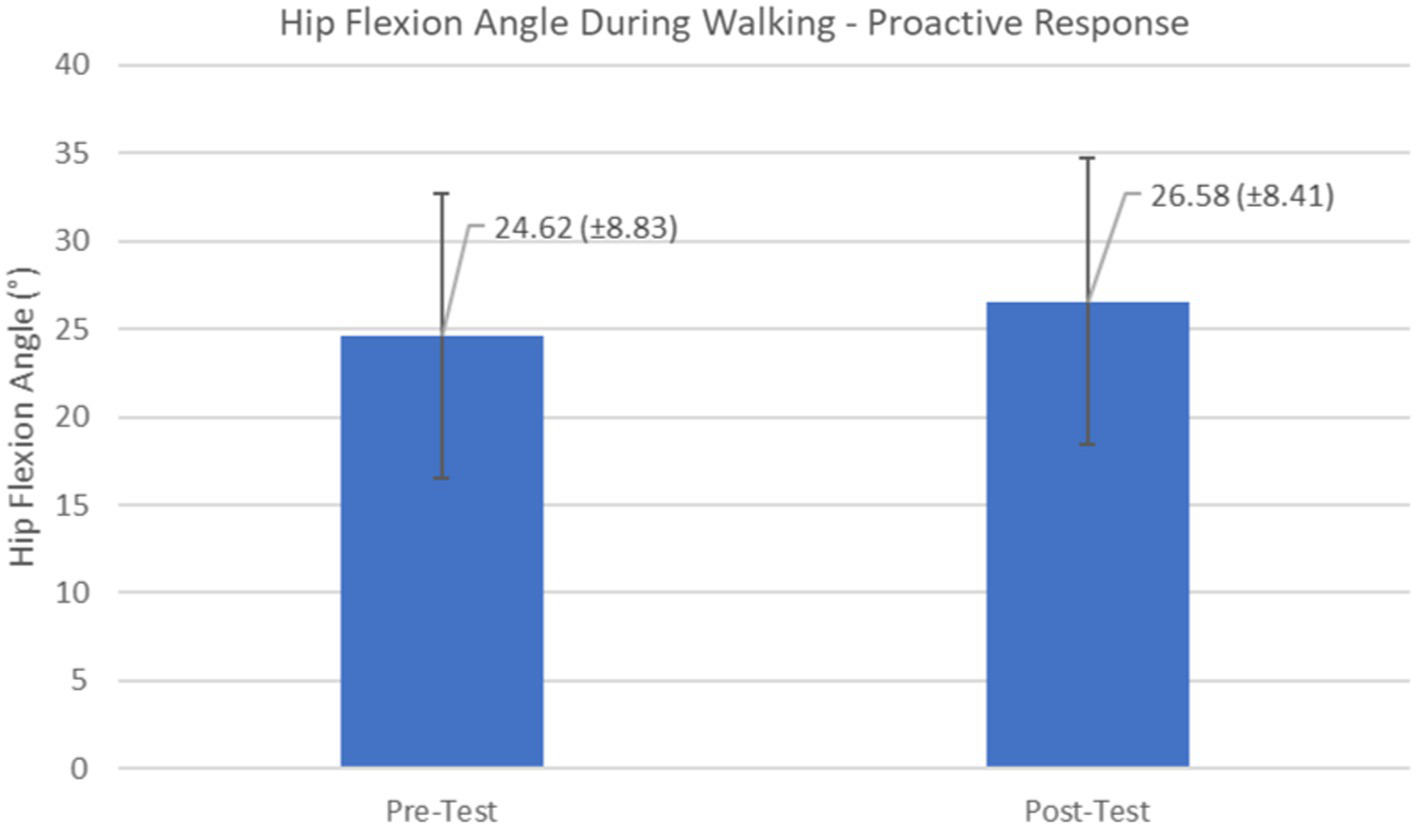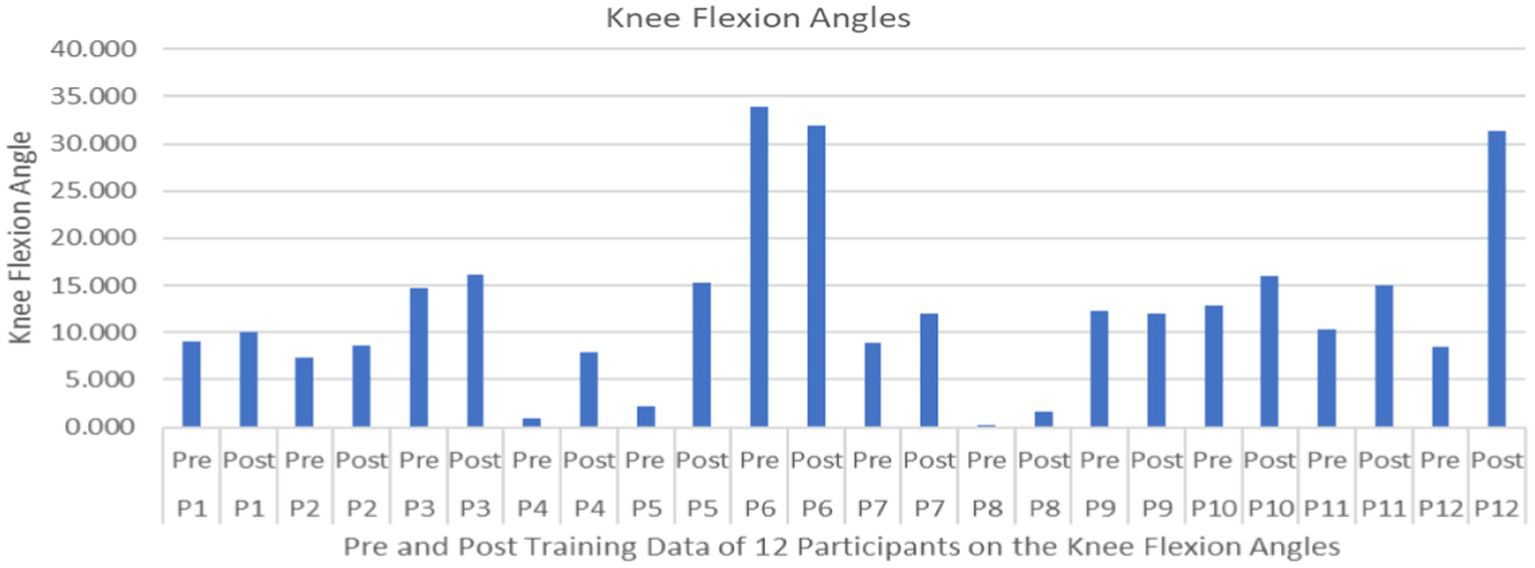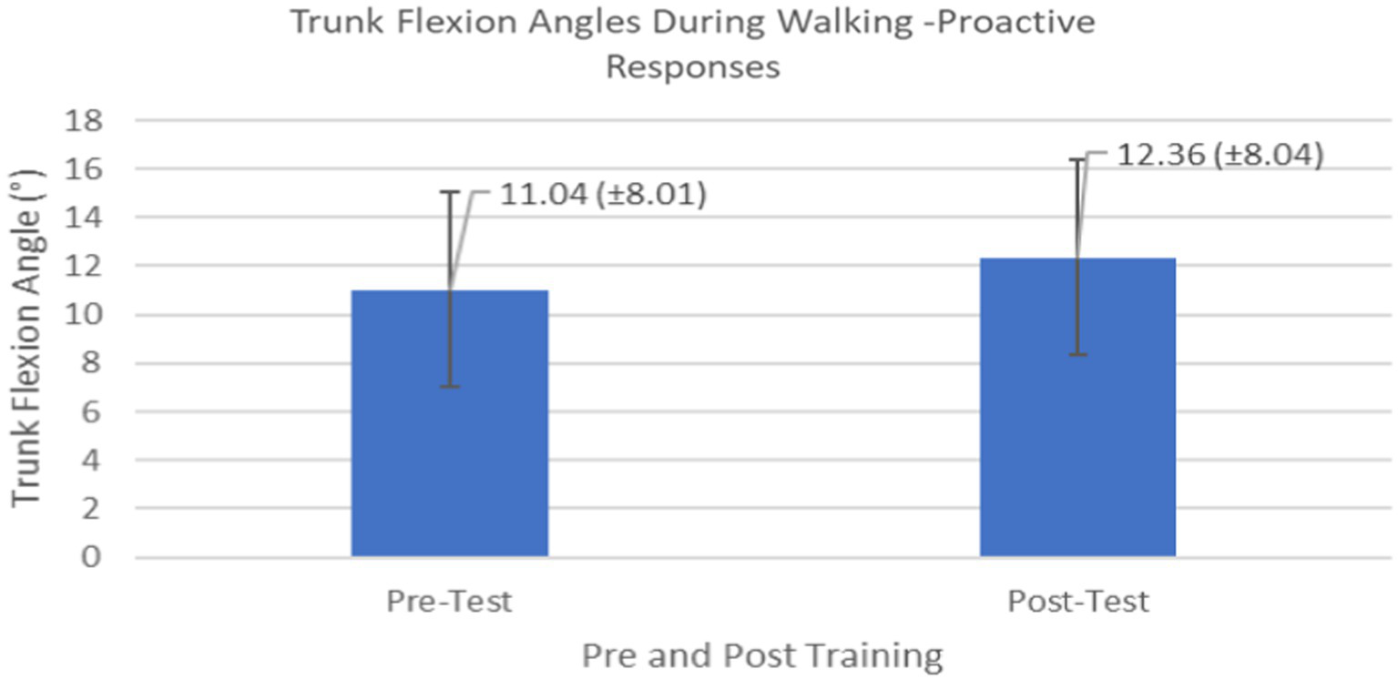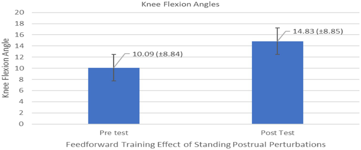 The results of the univariate repeated measures ANOVAs on all dependent measures associated with feedforward variables in Table 2 indicated a significant differences on only one of the feedforward variables – Knee flexion angle during pre and post-trial period (F1,10 = 5.662, p = 0.0386, effect size 0.259) (Figure 5). No significant differences were observed for the group comparison or generalizability of two types of training (F1,10 = 0.0102, p = 0.92) on the knee flexion angle or all other feedforward dependent measures in Table 2. In general, knee flexion angles were significantly different indicating a proactive response using the knee strategy (i.e., bending the knee to lower the whole body COM) to maintain stability (Figure 6).