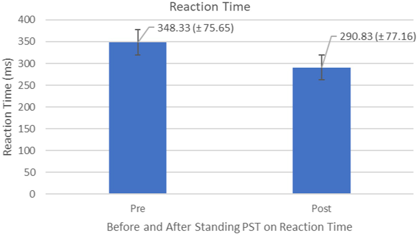 Feedback Effects of PST during stance on reaction time of the stance foot with the mean reaction times and standard deviations shown.