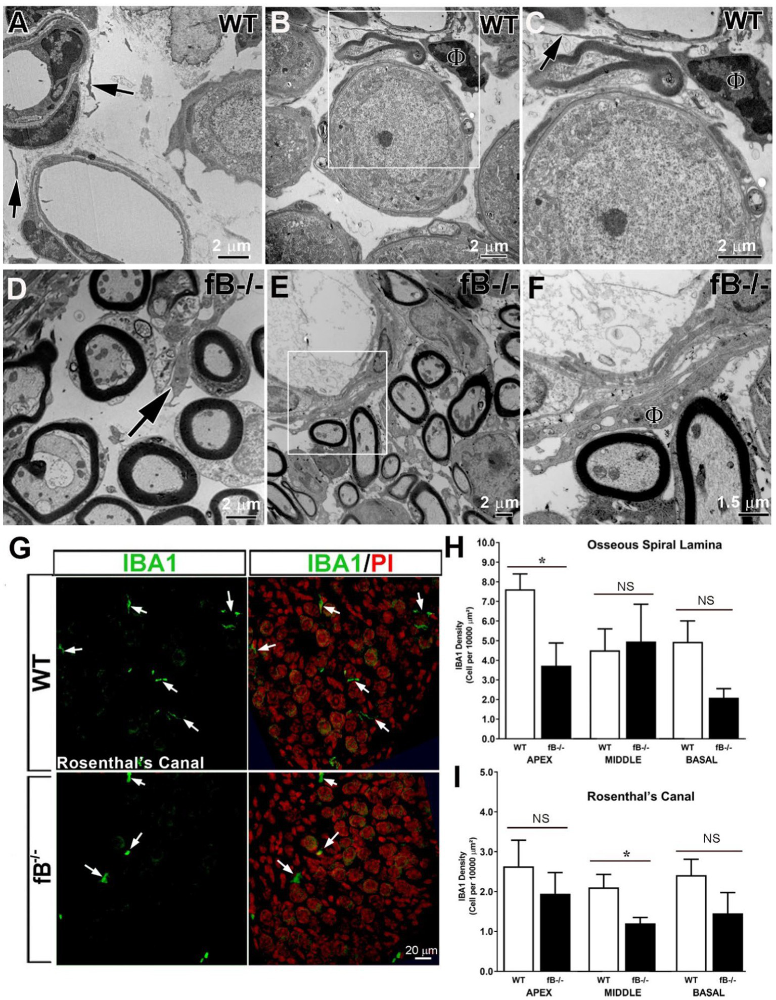 Complement fB deficiency does not significantly alter macrophage numbers in the adult auditory nerve. (A–F) Electron micrographs of macrophages (black arrows) in the auditory nerve of young adult WTs (A–C), young adult fB−/−(C) and P16 fB−/−(B,C) mice. (C) is a magnification of the boxed area in (B) showing a macrophage (ϕ) around a blood vessel with a long and thin cellular process (arrow). An arrow in (D) identifies a macrophage around the axons of the auditory nerve. (F) is a magnification of the boxed area in (E) showing an activated macrophage (ϕ) around a blood vessel. (G) Confocal images of IBA1+ macrophages in young adult WT (top panels) and fB−/− (bottom panels) mice. The images were taken within Rosenthal’s canal (RC) of the middle portions of the mouse cochleas. Nuclei were counterstained with PI. (H–I) Quantification of IBA1+ macrophages revealed no significant changes in macrophage numbers in most cochlear areas except in the apical portion within the osseous spiral lamina (OSL) and middle portion within RC in fB−/− mice. Data bars represent mean; error bars represent SEM. For the auditory nerve in the OSL, n = 7 and 6, n = 6 and 5, and n = 6 and 4 cochleas for WT and fB−/− mice in the apex, middle and base, respectively; For the auditory nerve within the RC, n = 5 and 4, n = 6 and 5, and n = 7 and 5 cochleas for WT and fB−/− mice in the apex, middle and base, respectively. Analysis was done with the Mann-Whitney U test; statistical significance was defined as a *p value of ≤0.05.