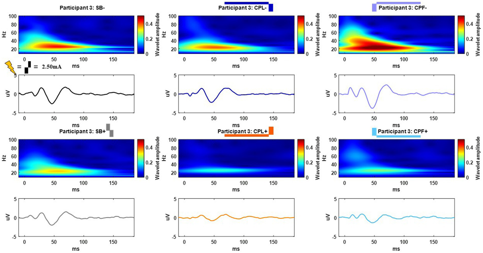 Prior to averaging, periods of muscle or other artifact contamination were removed automatically via custom scripts in MATLAB. The full trace from the C4 electrode (referenced only to Pz for this step) was band pass filtered in the 8–100 Hz range and chosen for artifact detection based on its proximity to the brain regions of interest discussed below. We observed infrequent activity by participants (i.e., coughs, shifting their weight in the chair, etc.) that would create 1–2 s artifacts during data collection that were excluded from analysis. In anticipation of this we collected up to 750 stimulation pulses, but were able to generate consistent evoked responses with fewer pulses. Thus, the minimum amount of summed pulses after artifact rejection across a few amplitudes and dispersed throughout each condition (CPL−/+, CPF−/+, SB−/SB+ in both the monopolar and bipolar configurations) was 450 pulses. The majority of averages exceeded 500 stimulation pulses. In circumstances where data acquisition personnel noted sustained artifacts during collection a trial was repeated to ensure at least 450 clean stimulation pulses. Instances where the amplitude of the signal exceeded 20uV were marked as periods of artifact contamination that were excluded from the evoked response calculation (see Supplementary Figure 1). Visual inspection of individual trials was also performed to validate the automated artifact removal. The composite average evoked potential for each pulse geometry and amplitude was comprised of 450–750 stimulus pulses distributed across individual continuous trials for each setting and aligned with the stimulus pulses using custom scripts in MATLAB 2021a (Mathworks, Natick, MA, United States). For the CPL geometry, the electrophysiology data for all analyses were aligned to the second, larger amplitude phase of the stimulus pulse (φ), as the conditioning pulse (ω) was subthreshold for eliciting a measurable response at such small amplitudes and large pulse widths. For scalp EEG data, the grand average of all EEG channels was subtracted from each individual EEG channel to remove common noise. A 10-point moving average filter to remove high frequency noise and 0.5 ms baseline subtraction was applied to remove the DC shift after averaging (16, 18, 20).