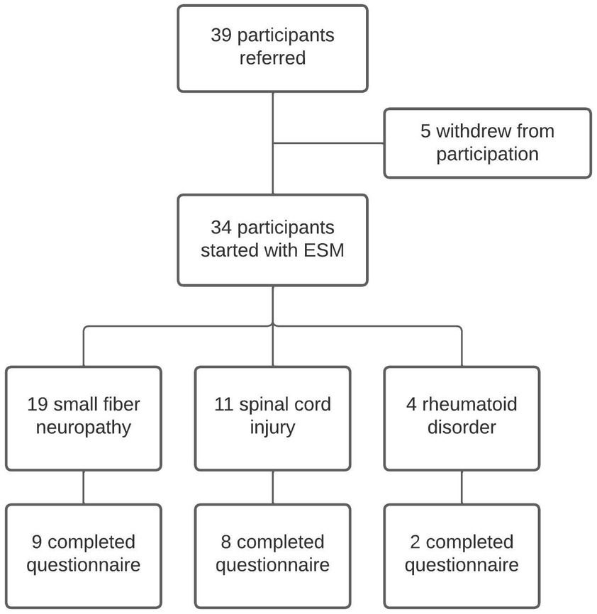 Thirty-four participants were included and filled in the ESM, of whom 19 were diagnosed with small fiber neuropathy, 11 with spinal cord injury, and 4 with a rheumatoid disorder. The mean age was 54.7 ± 13.9 years (range: 23–77) of whom 52.9% were female. In total, 19 participants filled in the general and user-friendliness evaluation about the acceptability and usability of the ESM. The general evaluation showed no influence of ESM on participants’ social contacts (mean 1.47, SD 1.12), activities (mean 1.74, SD 1.44), and mood (mean 1.89, SD 1.59). The answers options of ESM were a good representation of the experiences of participants (mean 4.58, SD 1.77). Regarding feasibility, the overall response rate for answering the beep signals of ESM was 44.5% in total. The missing rate per person varied from 13% to 97% with a median of 54.1%.