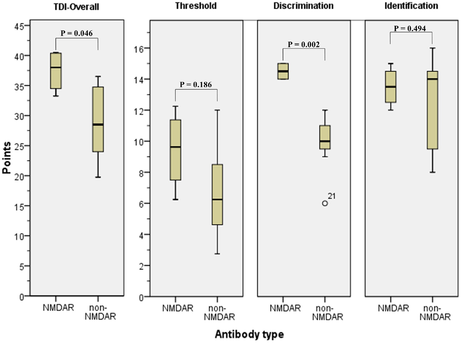 All patients of the NMDAR group were normosmic, whereas 3/7 patients of the non-NMDAR group were hyposmic (p = 0.236). The mean TDI-score of the NMDAR group was significantly higher than at the non-NMDAR group (37.4 ± 3.5 vs. 28.9 ± 6.8) (p = 0.046) (Figure 2). There were no significant differences between the NMDAR and non-NMDAR group in threshold (9.4 ± 2.6 vs. 6.8 ± 3.2; p = 0.182) and identification (13.5 ± 1.3 vs. 12.3 ± 3.2; p = 0.400). The discrimination was significantly higher in the NMDAR group (14.5 ± 0.6) in comparison to the non-NMDAR group (9.9 ± 2.0) (p = 0.002) (Table 4).