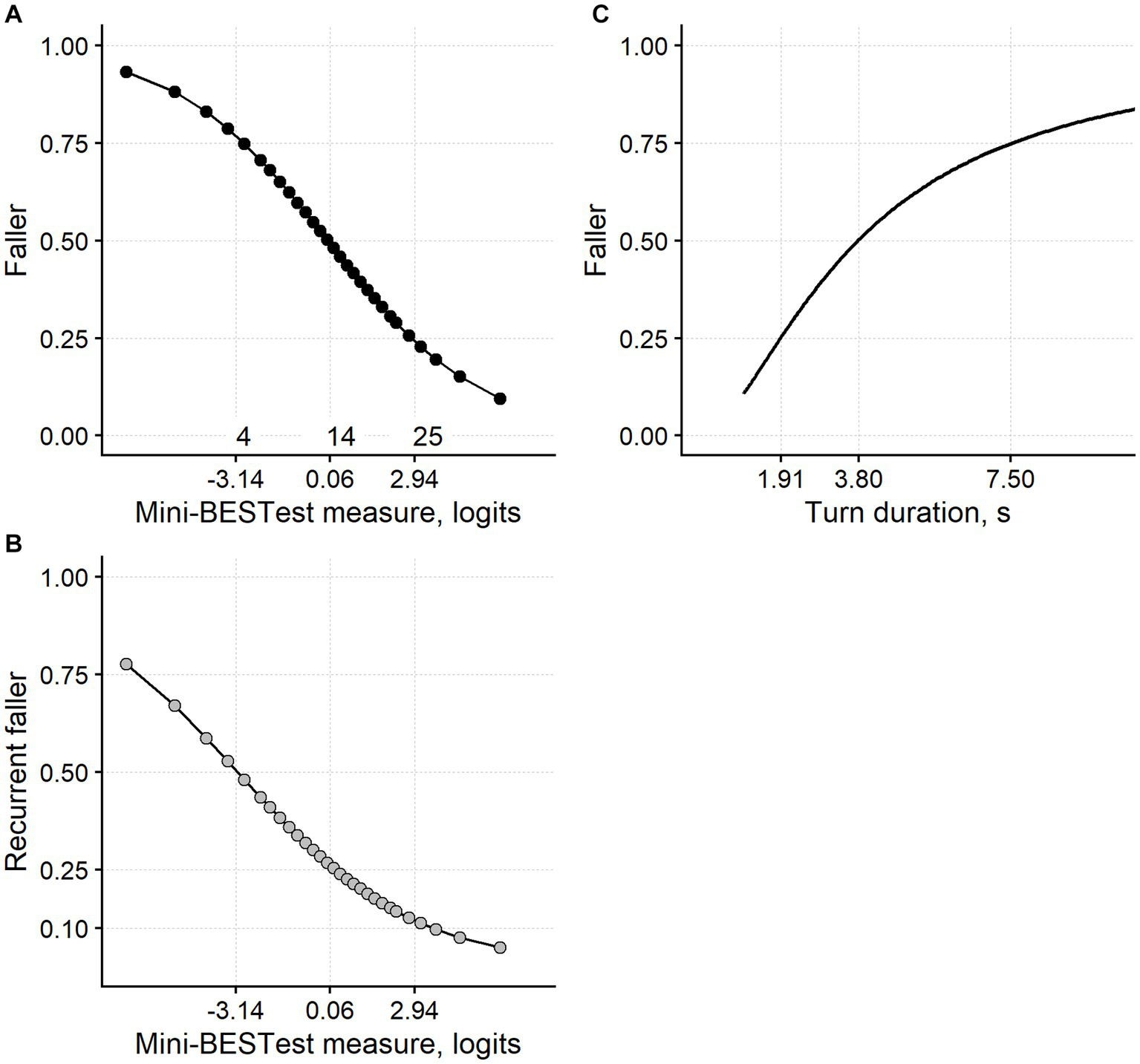 The conclusions of this study are as follows: (i) the Mini-BESTest scale and the turn duration of the TUG test predict the probability of a neurological patient falling at least once in 9 months; (ii) the Mini-BESTest, but not the turn duration, also predicts the patient’s probability of becoming a recurrent faller (i.e., falling two or more times); and (iii) the criterion validity of the TUG turning duration as a balance measure is high, and that of the Mini-BESTest is even higher.