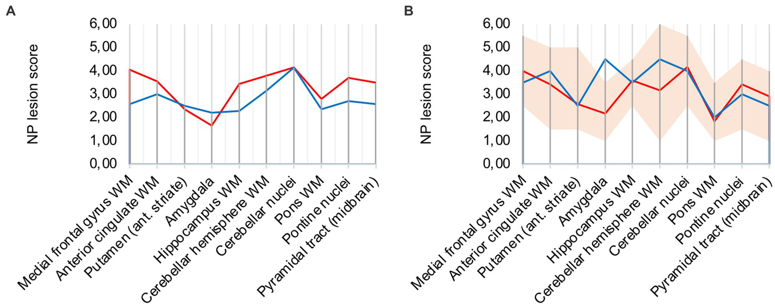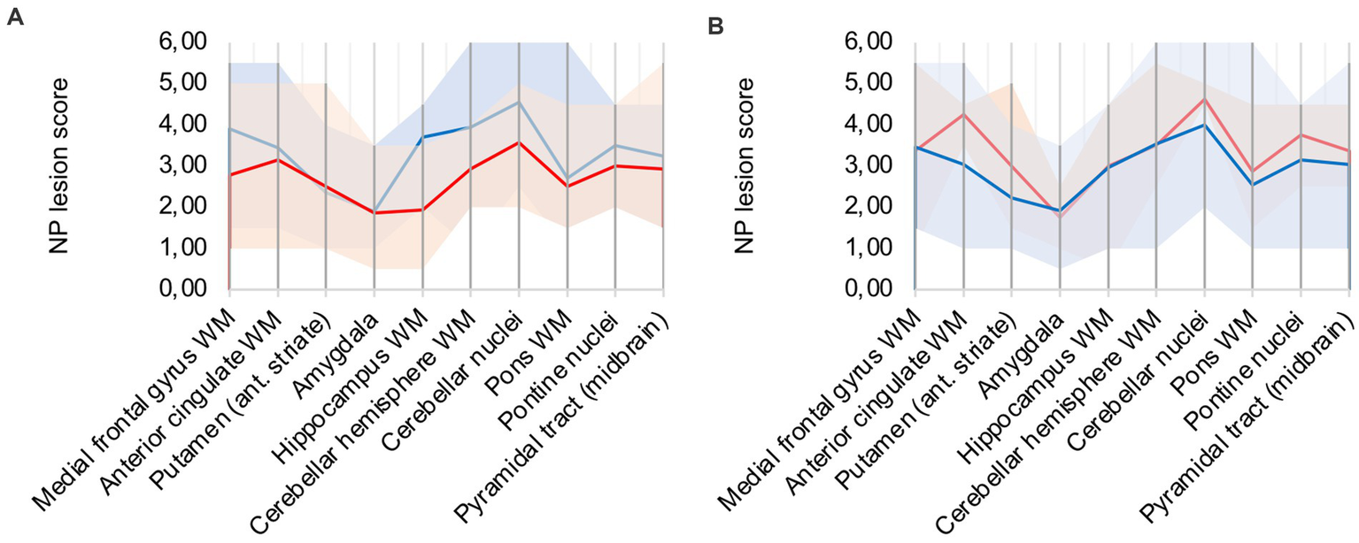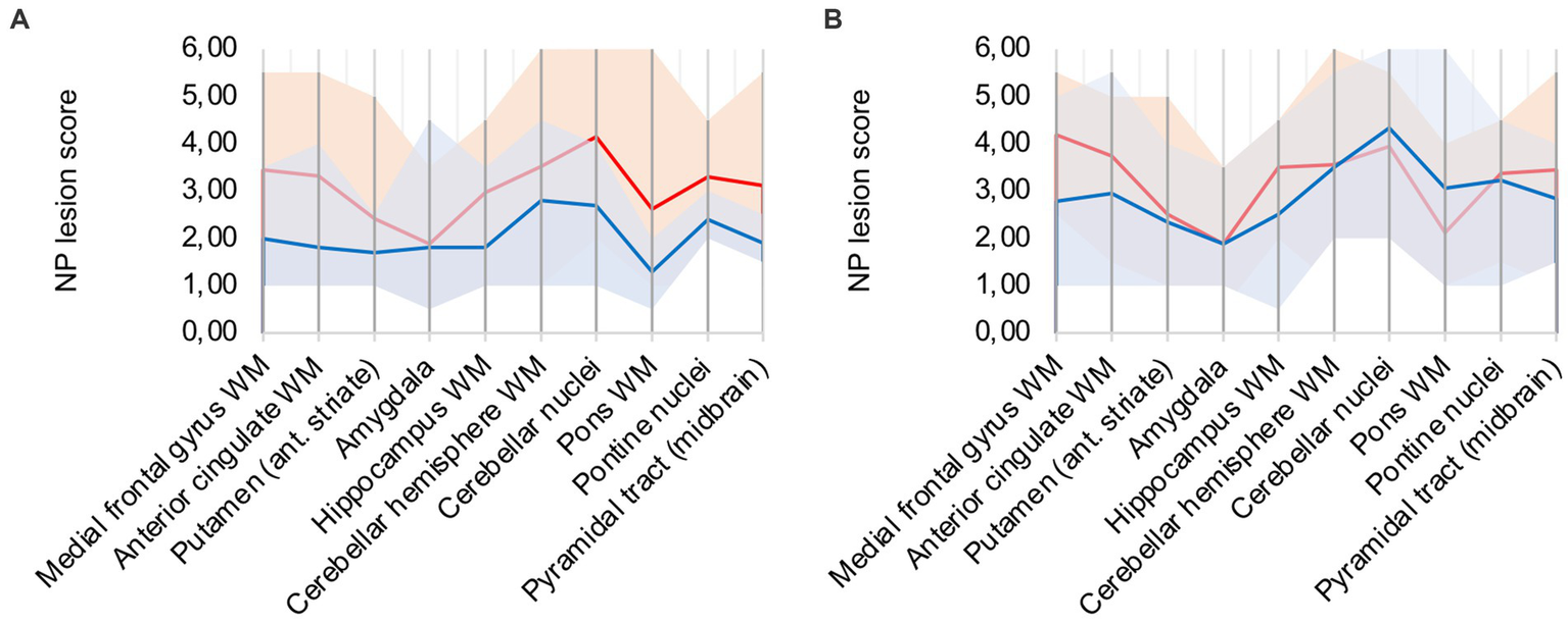 Both distinct patterns, diffuse parenchymal microglial activation and perivascular macrophage activation, were scored from 0 to 3 individually and subsequently aggregated as neuropathological lesion score (“NP lesion score”). Range of possible NP lesion score values is 0 to 6. Areas with the most pronounced changes compared to control patients were selected for graphical illustration. Groups were composed according to clinical variables. Ten areas were chosen for characterizing the lesion pattern in the brain of COVID-19 patients: the white matter of the medial frontal gyrus, the white matter of the anterior cingulate gyrus, the putamen at the level of the anterior striate, the amygdala, the white matter besides the hippocampus at the level of the lateral geniculate, the white matter of the cerebellar hemisphere, the cerebellar nuclei, the white matter of the pons, pontine nuclei and the pyramidal tract at the level of the midbrain. With the regions on the x-axis, line charts were plotted with the mean value and the range of grading scores for each analysis. For group composition, various clinical aspects were applied to determine influencing factors.