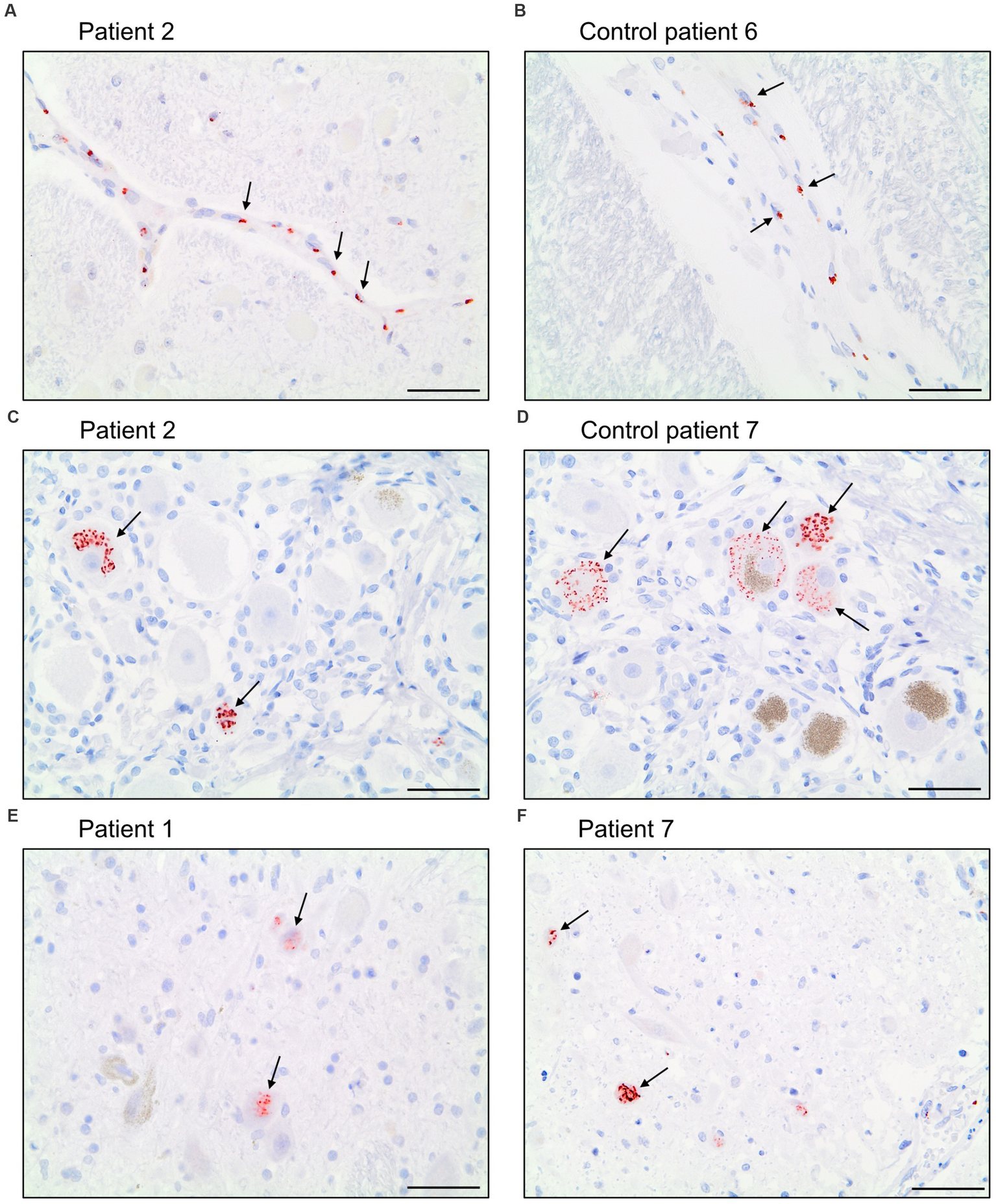 Figure 6. Immunohistochemical staining pattern of antibody Abcam 3A2 directed against SARS-spike glycoprotein. In the cytoplasm of cerebral endothelial cells fine, granular structures were detected in COVID-19 patients (A) and control patients (B). In neurons of the trigeminal ganglion a granular cytoplasmic staining different from lipofuscin granula was visualized in COVID-19- (C) and control patients (D) as well as in some neurons of nuclei of the vagus nerve of COVID-19 patients (E,F). Scale bars = 50 microns.