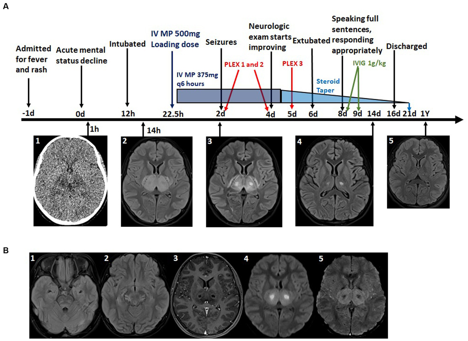 There are no standardized treatment guidelines for ANE; however, generally utilized treatment strategies combine immunosuppressive interventions and supportive/symptomatic management. The most frequently reported immunosuppressive therapy is high dose intravenous (IV) steroids [methylprednisolone, (MP) at least 30/mg/kg/day for at least 3 days] (8, 10–14). Additionally, case reports and case series report the use of intravenous immune globulin (IVIG) (10, 15, 16), plasma exchange (PLEX) (10, 16–19), and biologics such as tocilizumab (an IL-6 inhibitor) (8, 11, 19, 20). Supportive care and symptomatic management in an intensive care unit (ICU) is necessary in most cases for depressed mental status, seizure control, blood pressure support, multisystem organ failure management which often requires intubation (3, 8, 16, 19).