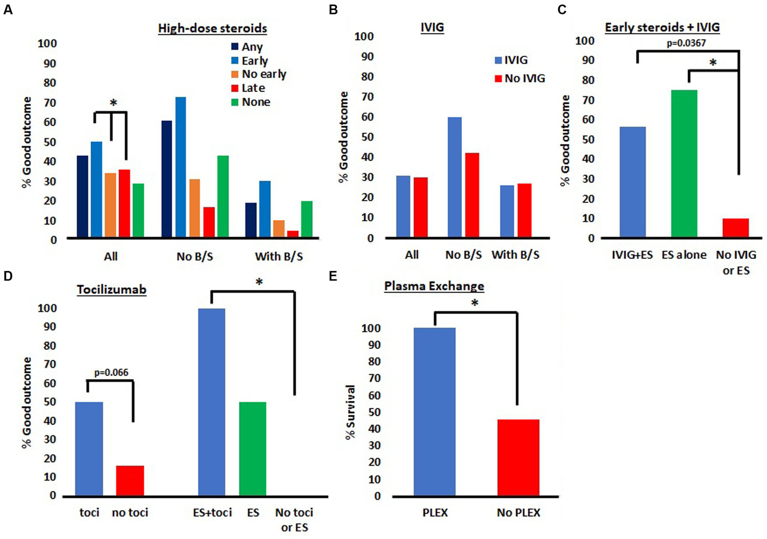 In all analyses (other than PLEX), the quantity of patients reported to have a “good outcome” were divided by the total number patients in that category to calculate the % good outcome. For the PLEX analysis, % survival was calculated instead. Frequencies of good vs. bad outcomes (or death for PLEX analysis) were compared individually with each other group and analyzed statistically using either 2×2 Chi-squared tests when all groups had an expected count >5 or Fisher’s exact testing when at least one group had an expected count <5. Both statistical tests were performed using a Social Science Statistic (Washington, DC, United States) online calculator. For all analyses where multiple comparisons were performed on the same dataset, a Bonferroni correction was used to reduce the risk of type 1 error. For the first analysis, the threshold for significance was adjusted to p = 0.01 for each group (all, no brainstem and brainstem) to account for each of the five comparisons. No adjustment was necessary for the IVIG analysis. For the combined steroid and IVIG analysis, the threshold for significance was adjusted to p = 0.017 to account for the three comparisons. For the tocilizumab analysis, no adjustment was required when comparing tocilizumab vs. no tocilizumab in all comers, however when groups were divided by tocilizumab ± ES, the threshold for significance was adjusted to 0.017 to account for the three comparisons being performed on each dataset. No Bonferroni adjustment to significance was required for the PLEX analysis.