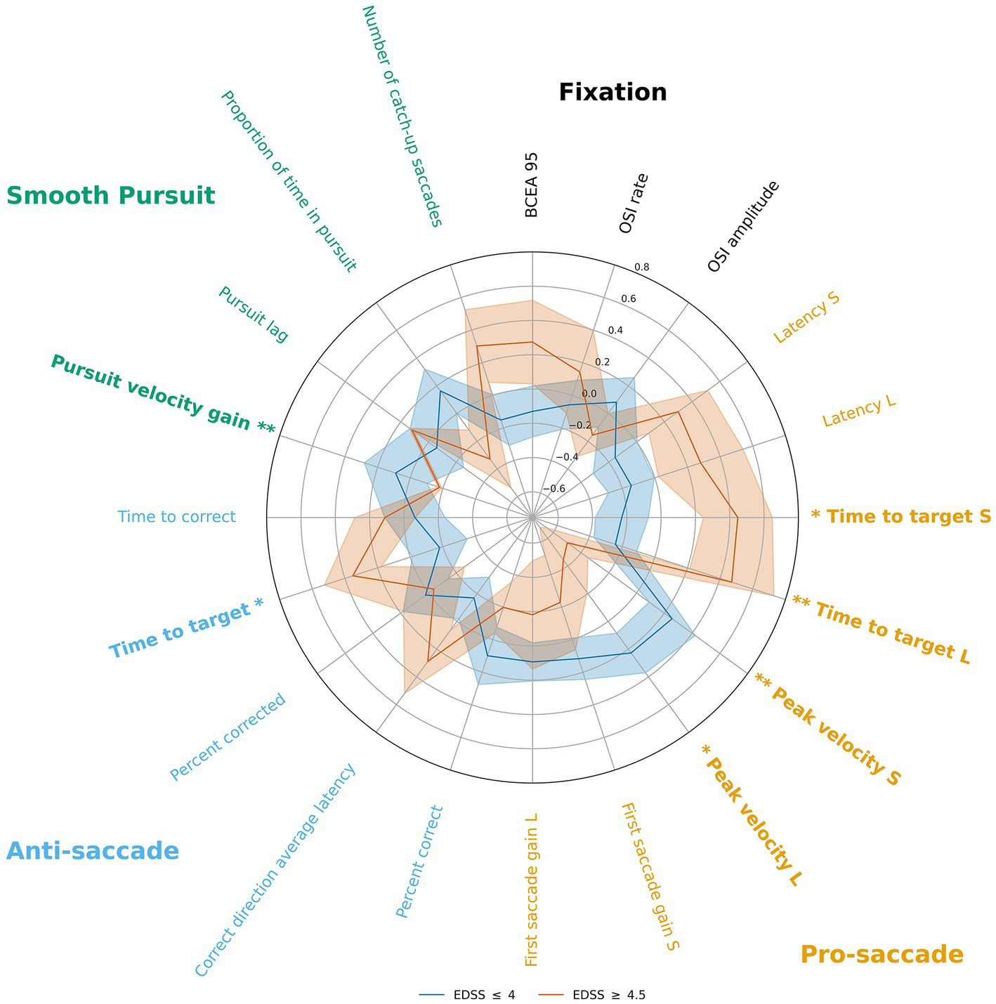 We furthermore performed an additional post-hoc exploratory analysis to determine which oculomotor parameters best distinguished high EDSS from low EDSS participants (results are shown in Figure 2 in the form of a radar plot). After z-scoring the parameter values relative to the entire group, high and low EDSS subgroups were compared and significant differences were found for almost all the same oculomotor parameters for which there was a significant correlation with EDSS, except for the two pro-saccade latency parameters and the antisaccade time-to-correct parameter, primarily those for which the monotonic relationship with the EDSS was the weakest amongs those that were significant.