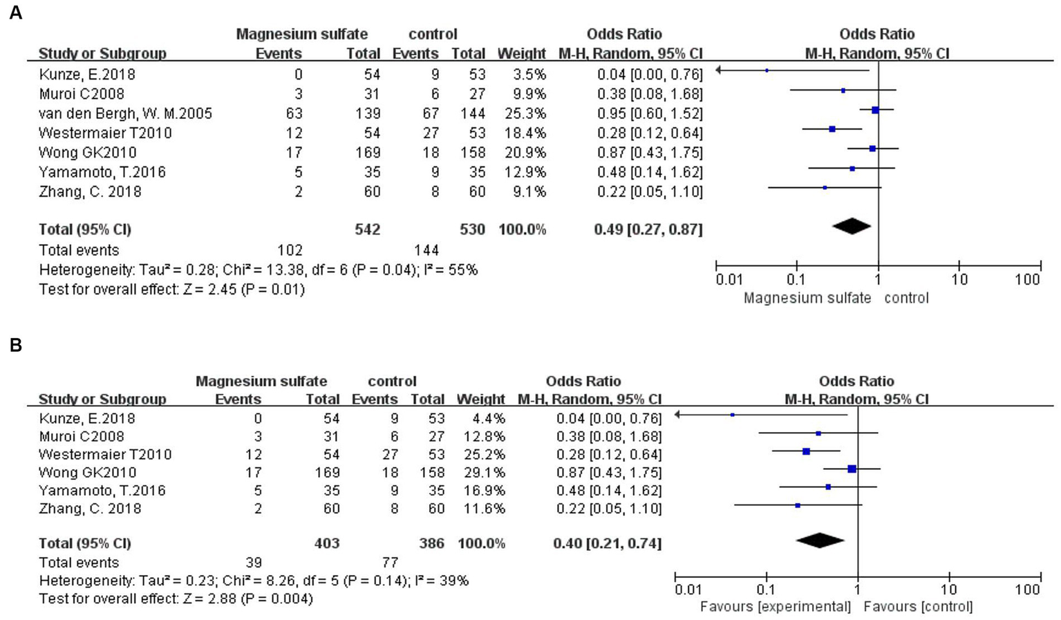 Seven studies (3, 6, 11, 13, 17, 18, 20) evaluated neurological dysfunction in 964 patients. There was no significant difference in neurological dysfunction between the magnesium sulfate and control groups [OR = 0.67, p = 0.16, 95% CI (0.39–1.16)] (Figure 8A). Further sensitivity analysis was performed due to the significant heterogeneity (p = 0.02, I2 = 60%). After excluding a study by Wong et al. (6), the heterogeneity was significantly decreased (p = 0.11, I2 = 45%) with a significant difference detected in favor of magnesium sulfate [OR = 0.55, p = 0.04, 95% CI (0.32–0.96)] (Figure 8B).