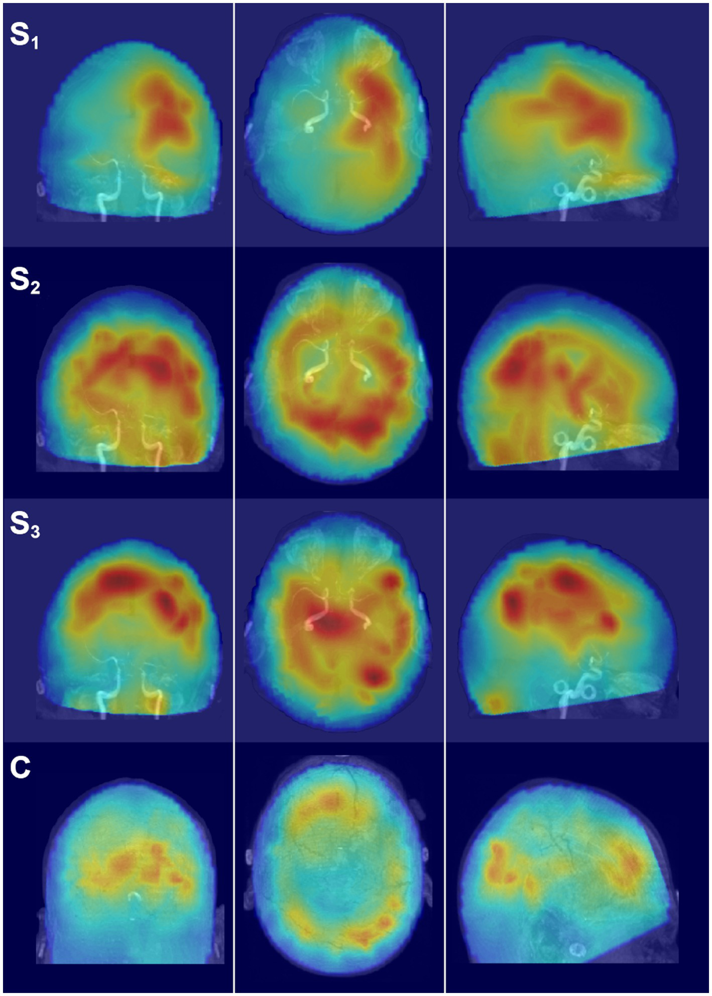 Glass brain SAM maps of activity changes. Each row depicts the coronal, axial, and parasagittal views of the SAM SPM plotted on the glass brain for the representative frequency band of alpha. Each row corresponds to a different scan time point for the patient (S1–S3) or for the representative control participant (C). Glass brain maps aid in the visualization of the distribution of activity throughout the brain volume. Maps are in radiological coordinates.