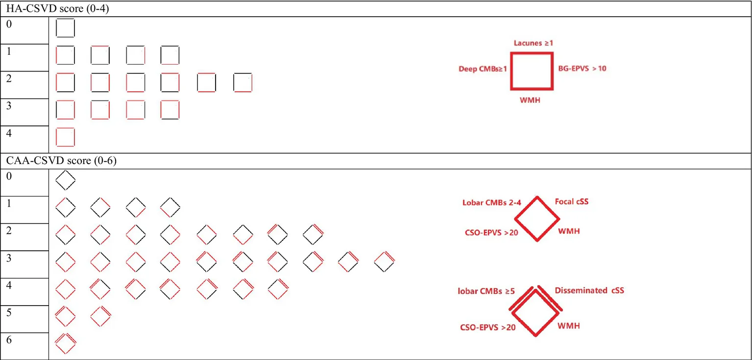 Red indicates the presence of a marker, and black represents the absence of a marker. WMH means deep Fazekas score ≥ 2 or periventricular Fazekas score 3. HA-CSVD score (ranging 0-4) was rated by allocating 1 point for deep CMB ≥ 1, lacunes ≥1, BG-EPVS > 10, and WMH, respectively, according to previous studies (15,16). CAA-CSVD score (ranging 0-6) was evaluated by allocating 1 point for lobar CMBs 2-4, focal cSS, CSO-EPVS>20, and WMH, respectively; and 2 points for the lobar CMBs ≥5, and disseminated cSS, according to previous studies (12,15).