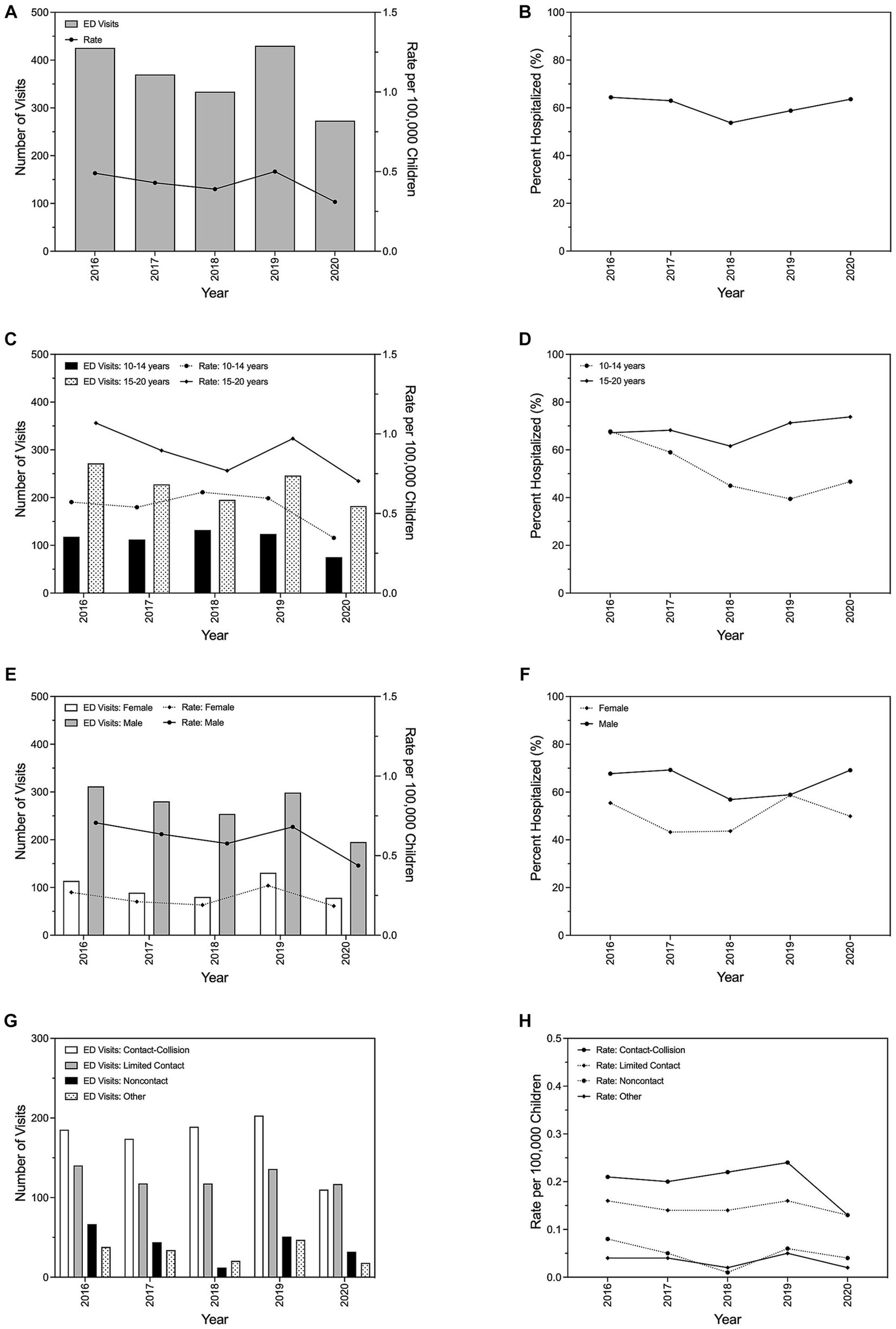Trends in emergency department visits for pediatric traumatic spinal cord injury resulting from sports-related injuries and subsequent hospital admissions in the United States, 2016–2020. Total number of visits and corresponding visit rate per year (A), and the proportion of visits resulting in immediate hospitalization by year (B). Annual emergency department visits, visit rate, and proportion of visits resulting in immediate hospitalization stratified by age (C,D) and sex (E,F). Total number of yearly emergency department visits (G) and corresponding annual visit rate (H) by sport type.
