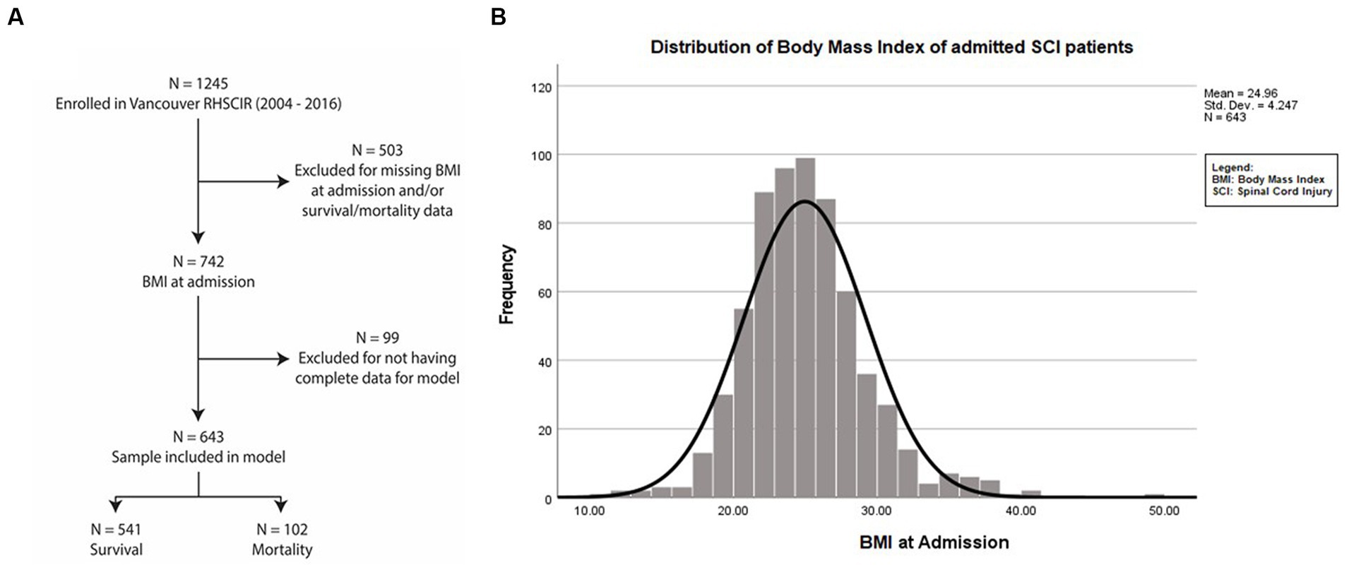 This is a prospective longitudinal cohort study consisting of 1,245 acute SCI patients admitted to the Acute Spine Unit of the Vancouver General Hospital between 2004 and 2016 who were enrolled in the Rick Hansen Spinal Cord Injury Registry (RHSCIR) (20). Individuals with missing weight and/or height data at admission and mortality data were not included in this study (n = 503). Cases without complete data for model adjustment were excluded (n = 99) from the analysis. The sample used for the analysis was 643 (Figure 1A).