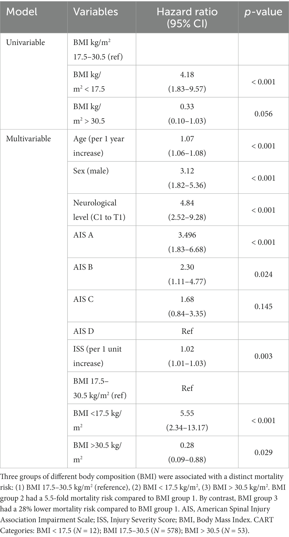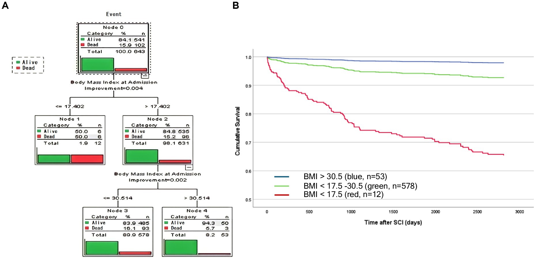 Results: After the exclusion of incomplete datasets (n = 602), 643 patients were analyzed, of whom 102 (18.5%) died during a period up to 7.7 years after SCI. CART identified three distinct mortality risk groups: (i) BMI: > 30.5 kg/m2, (ii) 17.5–30.5 kg/m2, and (iii) < 17.5 kg/m2. Mortality was lowest in the high BMI group (BMI > 30.5 kg/m2), followed by the middle-weight group (17.5–30.5 kg/m2), and was highest in the underweight group (BMI < 17.5 kg/m2). High BMI had a mild protective effect against mortality after SCI (hazard ratio 0.28, 95% CI: 0.09–0.88, p = 0.029), concordant with a modest “obesity paradox”. Moreover, being underweight at admission was a significant risk factor for mortality up to 7.7 years after SCI (hazard ratio 5.5, 95% CI: 2.34–13.17, p < 0.001).