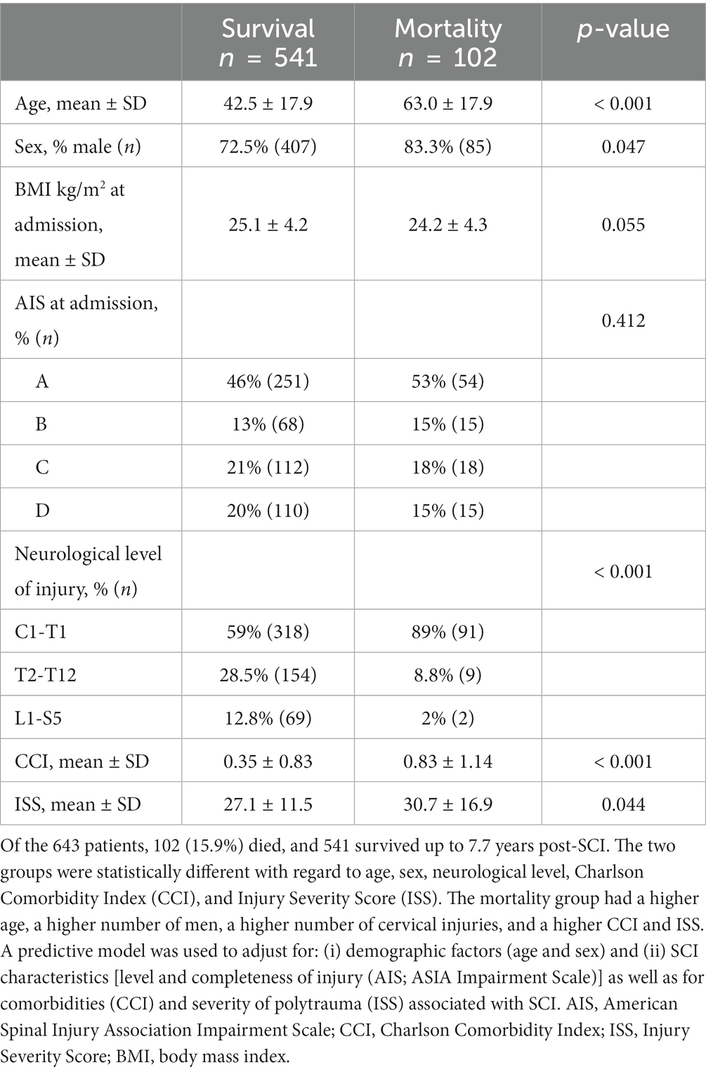 During the follow-up period, 102 patients (15.8%) were deceased as of 2016, and the mean time to death post-injury was 25.85 ± 26.04 months. Mortality rates were 2.2% at 1 month, 5% at 6 months, 6.5% at 1 year, 12.1% at 3 years, and 15.9% at 7.7 years following SCI. The mortality group was characterized by being older, comprising more men, having more injuries to the cervical cord, and having a higher CCI and ISS.