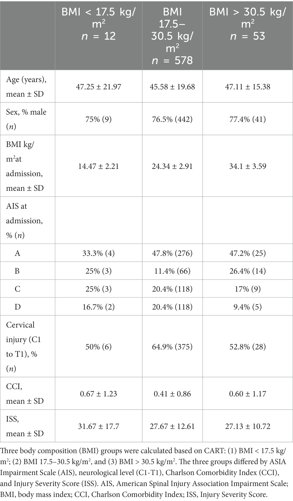 The three CART-defined BMI groups revealed a differing distribution based on the neurological impairment on admission (baseline), where there were more incomplete patients with SCI in the low-range BMI group and more cases with cervical SCI present in the middle BMI group. Other baseline characteristics that were slightly different between the groups were the CCI and ISS (Table 3). However, the differences in the neurological level distribution across the BMI groups had no effect on BMI-associated mortality (Supplementary Table S3).