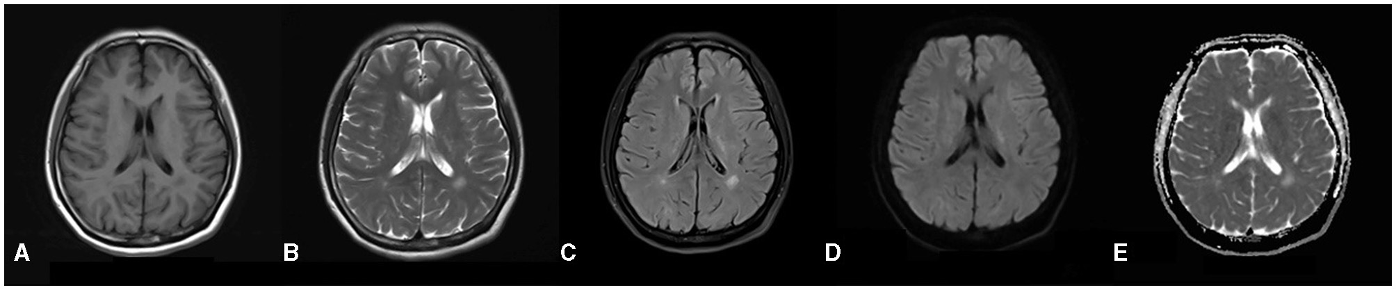 (A–E) Brain MRI reveals a distribution of abnormal signals localized around the ventricles, as well as within the frontal and temporal lobes. In the T1-weighted images, there is a depiction of slightly hypo-intense signals (A), while the T2-weighted images illustrate hyper-intense signals (B). The dark-field images similarly exhibit hyper-intense signals (C). Furthermore, both diffusion-weighted images and apparent diffusion coefficient (5) images do not indicate any restrictions in diffusion (D, E).