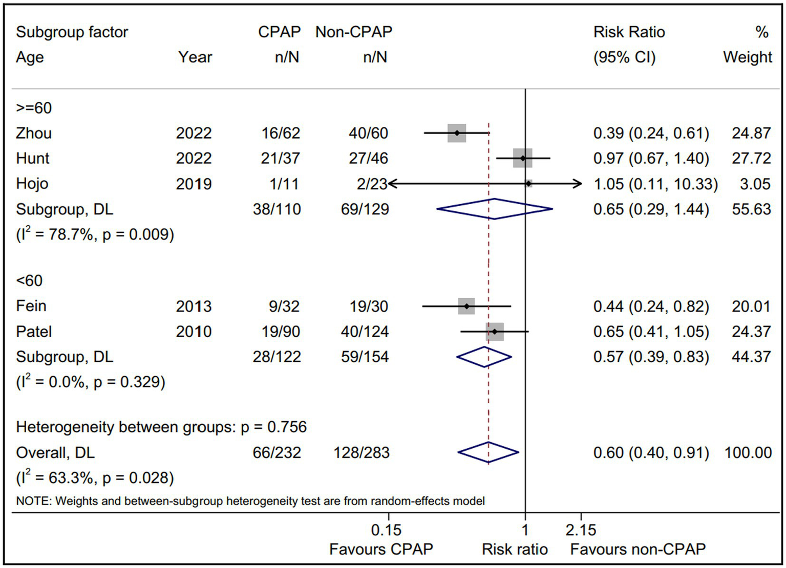 Considering the limited data, we separately evaluated the non-PAF proportion subgroup (Figure 4). The pooled AF recurrence with the five eligible studies (15, 16, 18, 19, 22) using a random-effect model was consistent with the pooled result from all eligible studies (15, 16, 18–23). Interestingly, a statistically significant intervention-covariate interaction for AF recurrence was identified in non-PAF proportion subgroup, including >50% subgroup (RR = 0.49; 95% CI, 0.35–0.68; p = 0.000) and ≤ 50% subgroup (RR = 0.97; 95% CI, 0.67–1.40; p = 0.866) with p = 0.006 for interaction. Meanwhile, the five eligible studies (15, 16, 18, 19, 22) reported the age between CPAP and non-CPAP group, and we found that compared with non-CPAP group, the AF recurrence of CPAP group was significantly decreased in <60 years subgroup (RR = 0.57; 95% CI, 0.39–0.83; p = 0.003) and it was not in ≥60 years subgroup (Figure 5).
