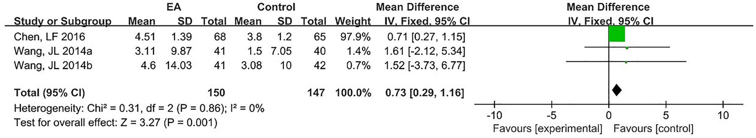 Two articles reported VFSS scores, including three pairs of trials, with 150 subjects in the experimental group and 147 in the control group. A meta-analysis of the three RCTs was performed using a fixed-effects model, and the results are shown in Figure 6. The results showed that the EA group showed more significant improvement in VFSS scores than the control group (MD = 0.73, 95% CI = 0.29 to 1.16, p = 0.001).