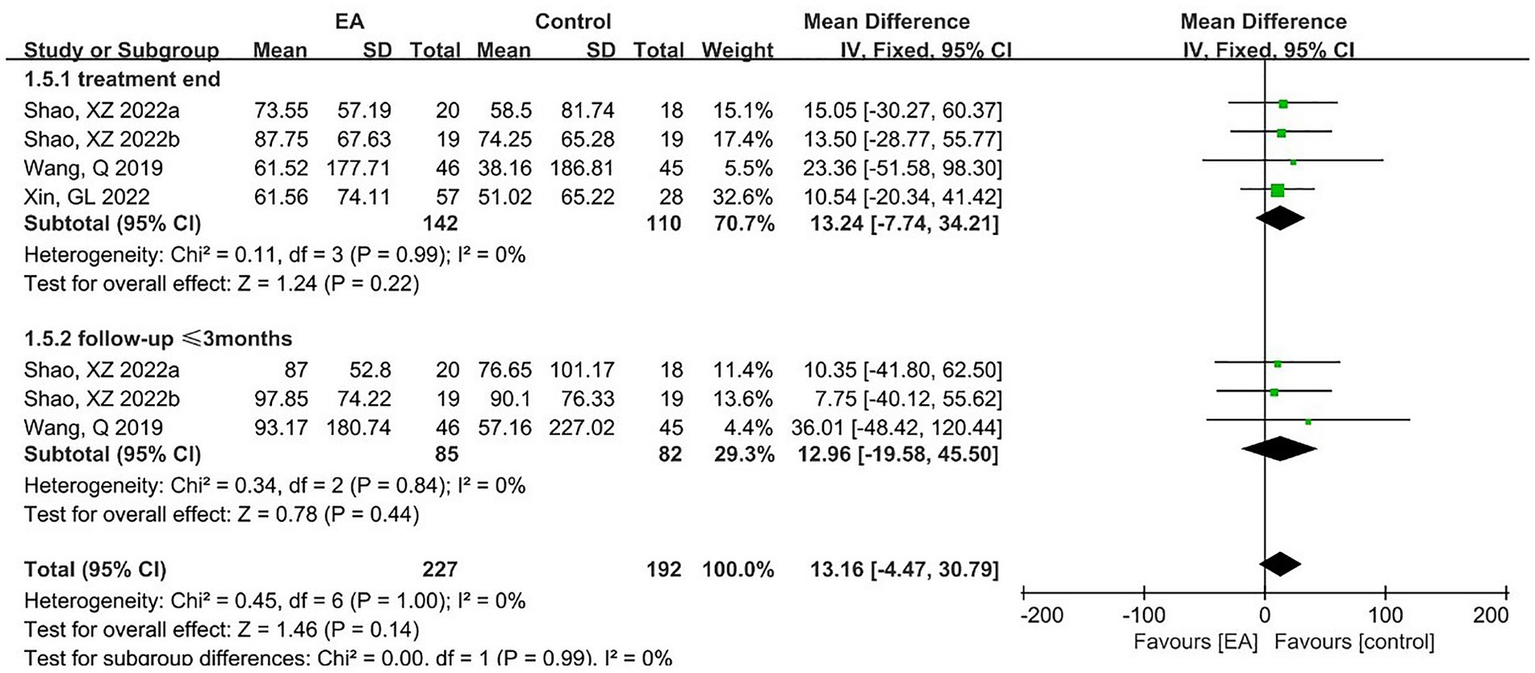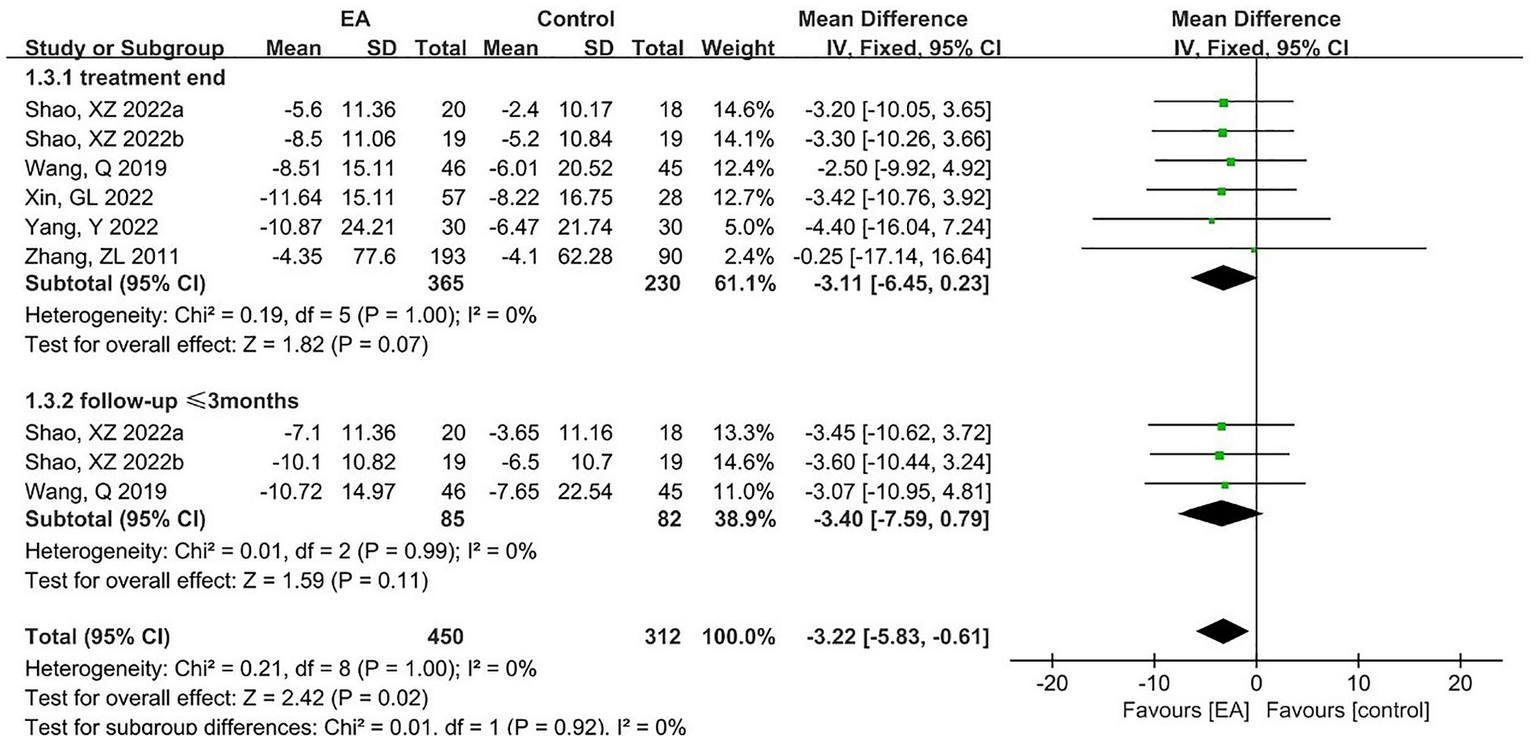Five articles reported SSA scores, including six pairs of trials, with 365 subjects in the experimental group and 230 in the control group. A meta-analysis of the six RCTs was conducted using a fixed-effects model, and the results are shown in Figure 7. The results showed that there was no statistical difference in SSA scores, although there was an improvement in the EA group (MD = -3.11, 95% CI = -6.45 to 0.23, p = 0.07). In addition, two articles (totaling three sets of trials) reported follow-up results. Subgroup analysis was performed and showed no statistical difference in SSA scores (MD = -3.40, 95% CI = -7.59 to 0.79, p = 0.11), but the combined effect size was statistically different (MD = -3.22, 95% CI = -5.83 to −0.61, p = 0.02).