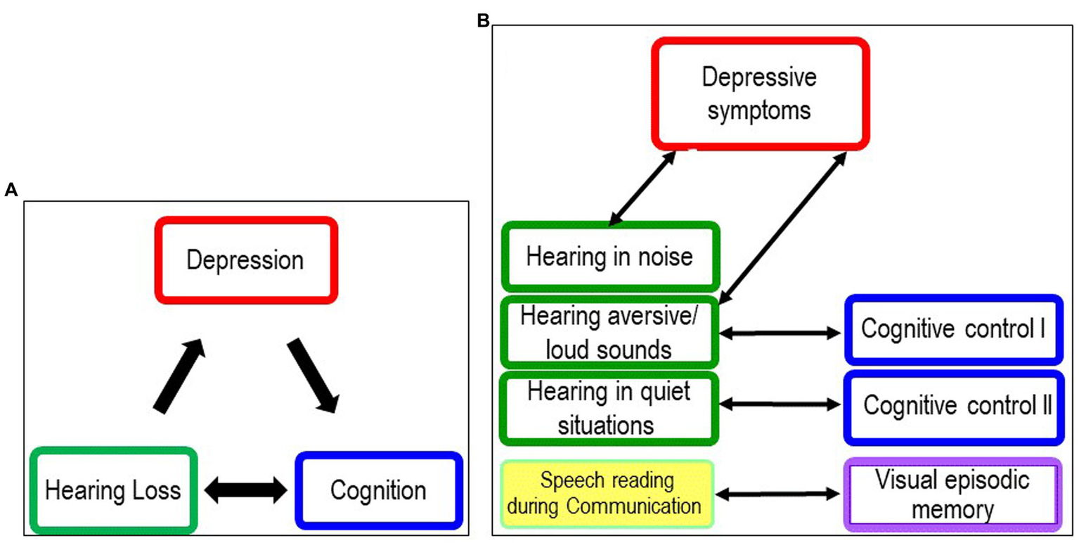 To date, only a limited number of studies have explored the potential link between depression resulting from hearing loss and cognitive decline in adults with hearing loss. One study (69) found that the cognitive decline in older adults with hearing loss, compared to normal hearing, was partially associated with the severity of depressive symptoms. Another study (70) observed that older adults with hearing loss and clinical depressive symptoms experienced greater cognitive decline over a 10-year period compared to those without depression. However, the question of whether there is a direct relationship between depression as a result of hearing loss and cognitive performance, as hypothesized in the models of Rutherford et al., Uchida et al., Sharma et al. (see above), has not yet been investigated (25, 27, 30).