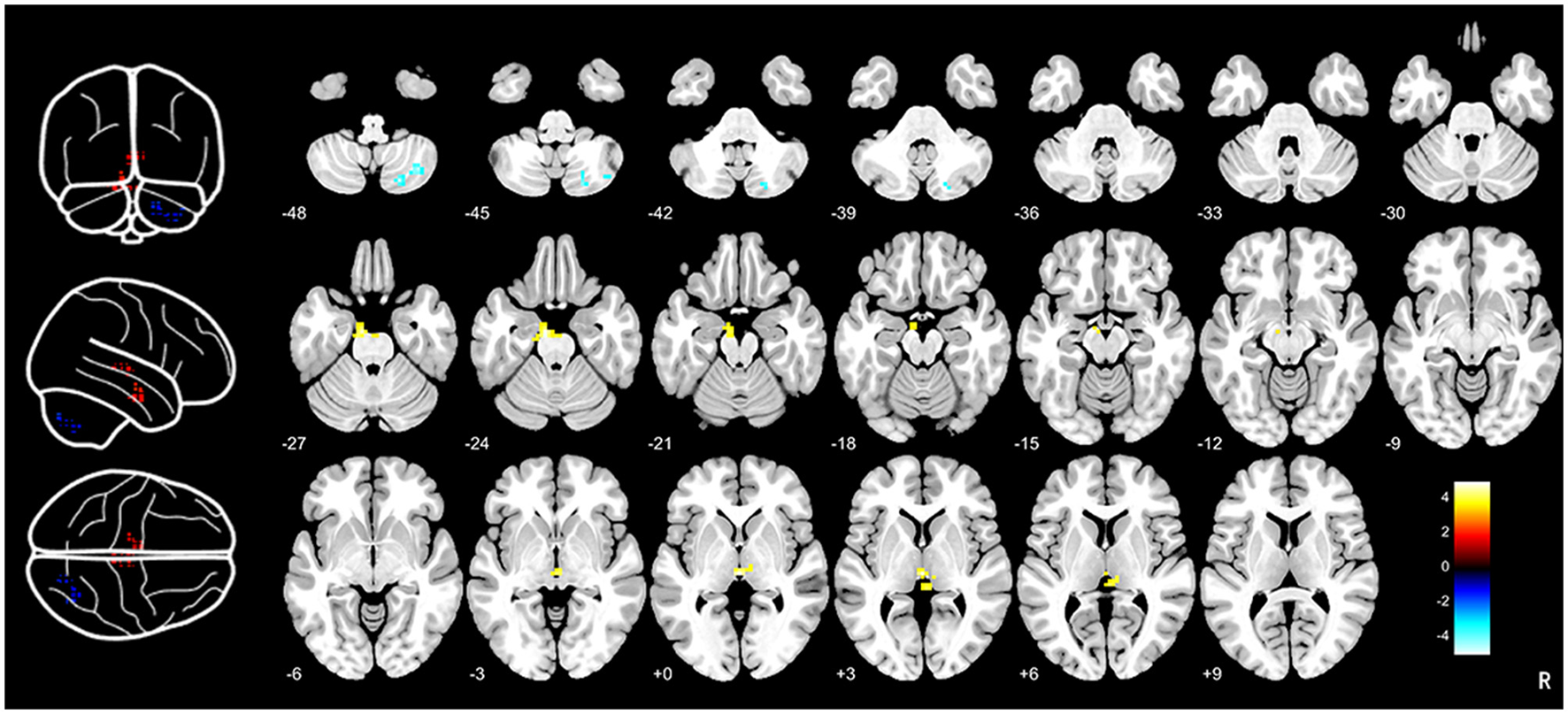 | Thalamus | 0 | −21 | 0 | 35 | 4.8069 | < 0.001 |