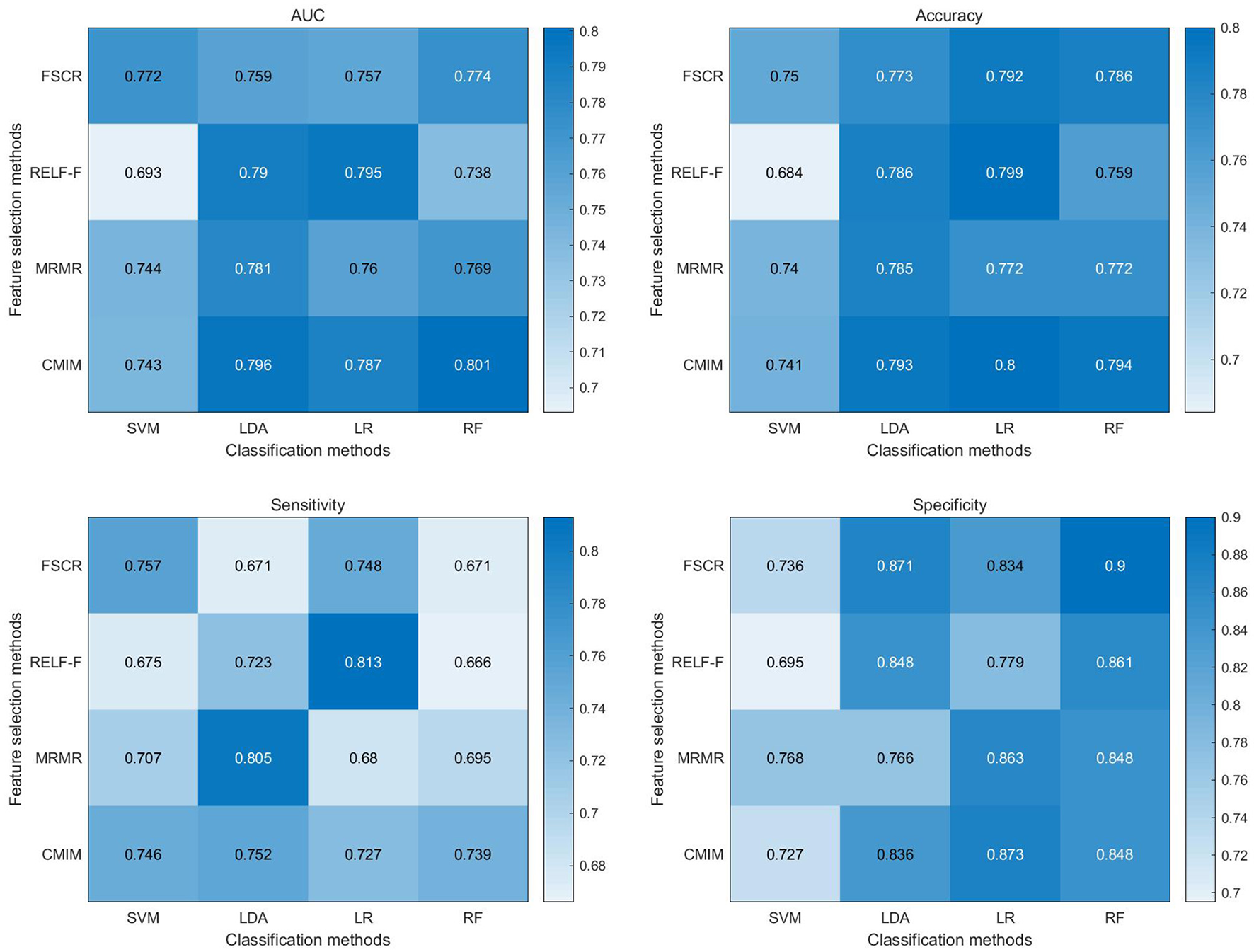 Heat map depicting diagnostic performance (AUC, accuracy, sensitivity, specificity) of paired feature selection (rows) and classification (columns) methods. FSCR, fisher score; RELF-F, relief-F; MRMR, minimum redundancy maximum relevance; CMIM, conditional mutual information maximization; LR, logistic regression; KNN, k-nearest neighbor; RF, random forest; RBF-SVM, support vector machines with radial basis function kernel; AUC, area under the curve.