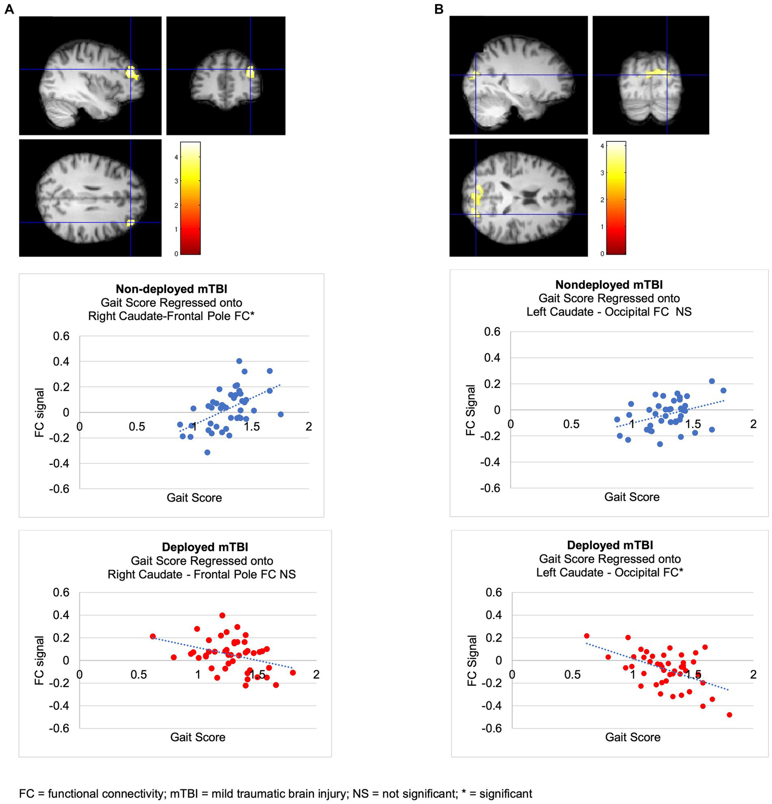 FC patterns differed for the two contextual types of mild TBI. Service Members and Veterans with deployment-related mild TBI demonstrated increased FC between the right caudate and lateral occipital regions relative to both the non-deployment mild TBI and TBI-negative groups. When evaluating the association between FC from the caudate and gait, the non-deployment mild TBI group showed a significant positive relationship between walking time and FC with the frontal pole, implicated in navigational planning, whereas the deployment-related mild TBI group trended towards a greater negative association between walking time and FC within the occipital lobes, associated with visuo-spatial processing during navigation.