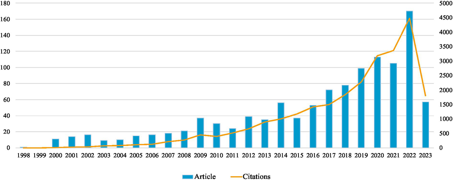 The analysis contains 1,097 papers published between 1998 and 2023, containing 885 articles and 212 reviews. The total h-index is 69, the total number of citations is 24,141, and the total number of frequently referenced articles is 21.99. Figure 2 depicts the annual publication and citation counts for PSD rehabilitation, which shows a generally consistent but unstable growth trend, with a slow increase in the number of publications between 1998 and 2013, ranging from about 10 to 40 articles per year, and then an accelerated growth beginning after 2014, except a slight decline in the number of publications in 2015 and 2021. The overall trend is upward and will peak in 2022, indicating that researchers are focusing more on PSD rehabilitation.