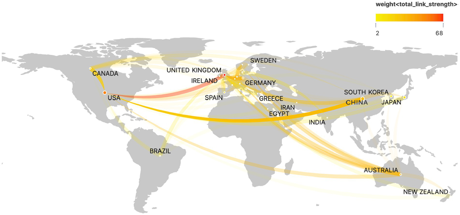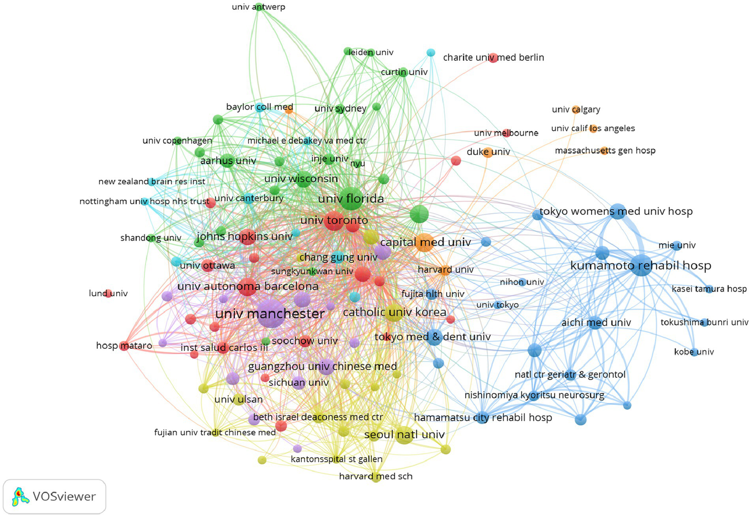 PSD rehabilitation research is being conducted in 239 countries/regions by 3,706 institutions. The top 10 countries and institutions are given in Table 1 determined by the number of publications. The United States has the most publications and citations (193 articles, 7,994 citations), followed by China (186 articles, 1,555 citations), and Japan (131 articles, 2,034 citations), which account for nearly one-half the total number of publications in the field. Figure 3 depicts how a country cooperation network is used with VOSviewer and Scimago Graphica. The thickness and hue of the collaboration network connecting lines can show the degree of cooperation between countries or areas, with the closer the node color to red suggesting the intensity of the research collaboration. The analysis results indicate that the UK has the strongest international collaboration strength (with 68 total connection strengths), forming an extensive research collaboration network between the UK, the US, China, and Canada. The h-index is an estimate of a scholar’s or country’s scientific impact (18), and it balances the relationship between the number of published papers and their quality (the impact of the papers or the number of times they are cited) to provide a more complete picture of the impact of a scholar’s research results. An examination of the PSD science field’s h-index (Table 1) reveals that the United States has the greatest h-index (40) and total scientific research impact. The analysis of the PSD science field’s h-index (Table 1) reveals that the United States has the greatest h-index (40) and total scientific research impact. However, it is worth mentioning that, despite accounting for a small number of publications, the United Kingdom and Canada rank second only to the United States in terms of article citations and h-index, and their significance should not be overlooked. Additionally, while China ranked second in terms of publications, it ranked in the middle of the pack in terms of h-index (23) and article citations (1555), indicating that the academic impact of the field is limited and that high-quality research needs to be conducted to increase the academic impact of the field.