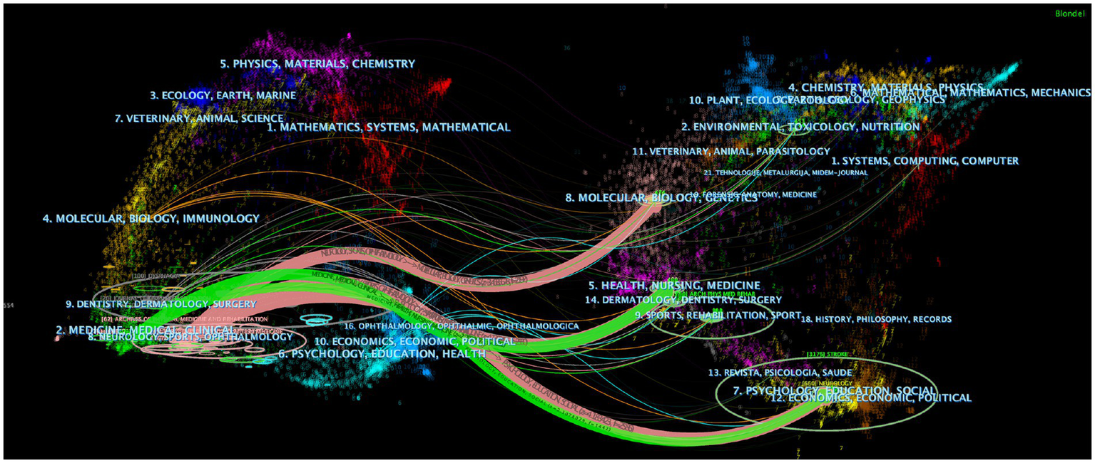 Following this, we used CiteSpace to analyze the included literature with a dual map overlay (Figure 6), which links the cited journals on the left to the cited journals on the right to provide a clear, visual interpretation of citations for various combinations of publications, allowing for the identification of citation relationships, subject distributions, and patterns of movement across multiple disciplines (19). The ellipses on the map depict the number of publications relating to journals and the ratio of authors to the number of publications. The length of the ellipse represents the number of authors, the width of the ellipse represents the number of publications, and the curves between the left and right sides of the map are citation links, the trajectories of which provide an interpretation of the field’s interdisciplinary relationships. The Z score thicker the links, the greater the score of the score function. Finally, we identified 5 major citation trajectories (pink and green), with publications in the fields of Neurology, Sports, and Ophthalmology (pink trajectory) influenced by publications in the domains of Molecular, Biology, and Genetics (Z = 3.46, f = 2,192), Health, Nursing, and Medicine (Z = 4.13, f = 2,560), and Psychology, Education, and Social (Z = 4.18, f = 2,586). Furthermore, past publications in the Health, Nursing, Medicine (Z = 2.79, f = 2,822) and Psychology, Education, and Social (Z = 2.11, f = 1,442) domains influenced publications in the Medicine, Medical, and Clinical (green track). Overall, this implies that the topic of PSD rehabilitation is strongly tied to basic scientific, clinical, nursing, and social subjects and that there is scope for multidisciplinary, collaborative study.