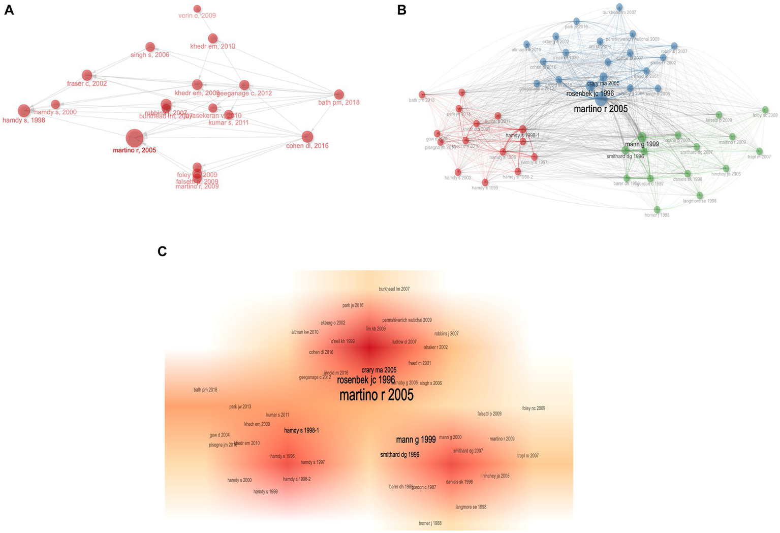 To ensure the precision of data analysis, we initially leveraged the ResearcherID and ORCID functionalities of Web of Science to discern each author. Both systems bestow a distinct identifier upon every author, effectively addressing issues stemming from name ambiguities. Subsequently, before inputting data into the bibliometric analysis software, we inspected the raw data using Excel. Variations of names that unmistakably belonged to the same author were manually consolidated. Through our analysis, it was determined that the PSD rehabilitation domain encompassed contributions from a total of 4,991 authors. For our analysis, we used the Bibliometrix R package (4.1.3) in conjunction with R version 4.3.1, which allowed us to access representative scholars in the field to understand core research trends (20). The top 10 authors and co-citing authors of PSD rehabilitation research are shown in Table 3. The author with the most publications is Hamdy S from the University of Manchester (35 papers, 3.00%, h-index = 20), followed by Wakabayashi H (26 articles, 2.37%, h-index = 12) and Yoshimura Y (23 articles, 2.09%, h-index = 11). Hamdy S is also the most cited author (545 citations), with Martino R (461 citations) and Smithard DG (374 citations) coming in second and third, respectively. Figure 7A depicts a timeline of prominent authors in the field of PSD rehabilitation research, with the larger red circle representing the scholar’s contribution to the discipline’s research area. Hamdy S is a key pioneer in the subject, and his study “Recovery of swallowing after dysphagia stroke relates to functional reorganization in the intact motor cortex” is an example of his work (21). This paper investigates the mechanisms of swallowing recovery in PSD, implying a role for intact hemisphere reconfiguration in recovery and laying the groundwork for future research areas in PSD rehabilitation. The author cooperation network diagram (Figure 7B) depicts collaboration and relationships between authors and co-citing authors in the field. The author collaboration network formed by combining Figures 7A,B demonstrates that Martino R from the University of Toronto plays an important role in bridging the gap between research in the field, as demonstrated by his work “Dysphagia after stroke: incidence, diagnosis, and pulmonary complications, “which determined the prevalence of dysphagia and associated lung function impairment in stroke patients (2). The study has raised concerns among PTSD researchers about the link between dysphagia and pneumonia. Bath PM is a co-author of a new study in this field, “Swallowing therapy for dysphagia in acute and subacute stroke,” which suggests that swallowing therapy may minimize hospitalization, dysphagia, and chest infections while also improving swallowing capacity. Chest infections, and may improve swallowing ability and provide new ideas for future swallowing therapy (22), providing new ideas for future swallowing therapy. Figure 7C shows that the thicker and larger the author’s name near the red colored block, the more influential that author is in the discipline, showing that Martino R is the most influential academic in this field of study.