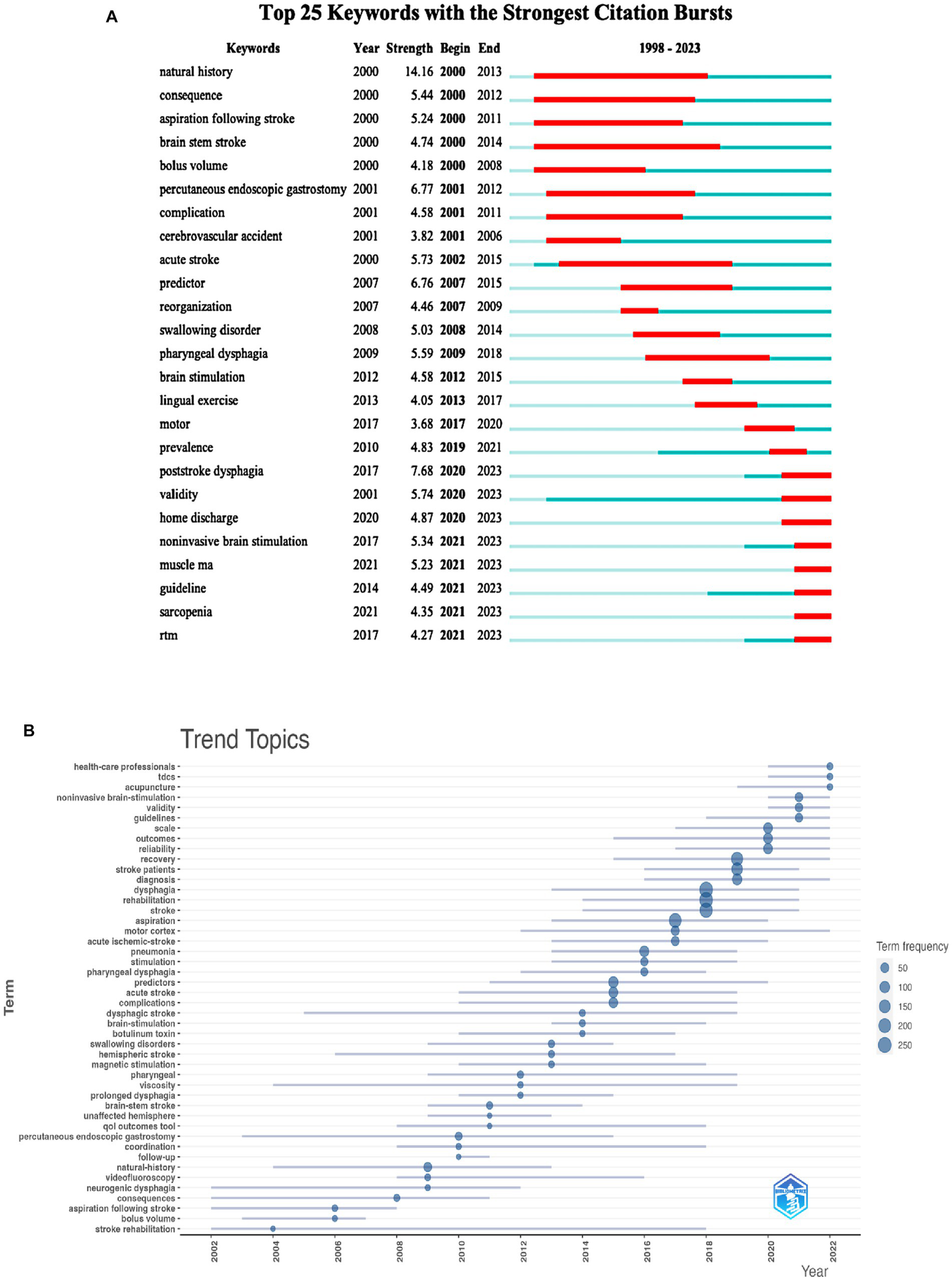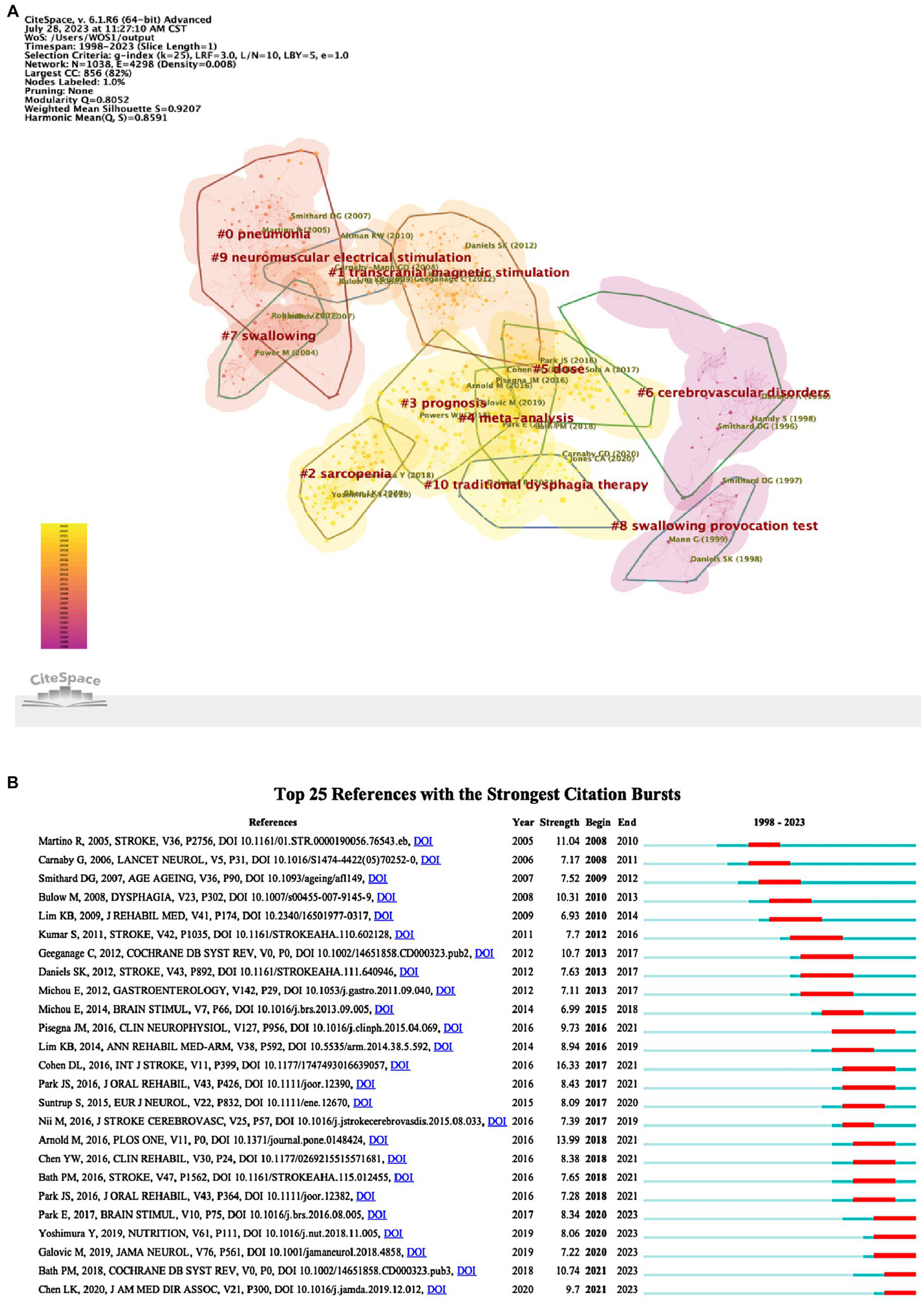 Table 4 shows the top 10 most referenced references in the PSD rehabilitation study domain. Among these, “Dysphagia after stroke: incidence, diagnosis, and pulmonary complications” had the most citations (326), and it was written by Martino R, which correlates to the previous study’s findings. This matches the results of the preceding author’s contribution analysis. In addition to being the most cited document, “Interventions for dysphagia and nutritional support in acute and subacute stroke” had the highest centrality (Centrality = 0.08). This article focuses on analyzing the impact of swallowing therapy, feeding, nutrition, and fluid supplementation on functional outcomes and death in patients with acute or subacute stroke with dysphagia (23), and it informs future research on nutritional support for stroke patients. After reviewing the 10 cited references, we discovered that this research focused on PSD etiology and neuroplasticity processes, intervention approaches, rehabilitation tactics, and complication prevention. CiteSpace was used to cluster the co-cited references (Figure 8A), CiteSpace provides two indicators, the module value (Q value) and the average profile value (S value), which can be used to judge the effectiveness of the mapping, the Q value is generally in the interval of [0, 1], the Q > 0.3 represents the division of the structure of the significant, the S > 0.7, that is, the clustering reaches a high efficiency, that is, the results are credible. The grouping coefficients are Q = 0.8052, and S = 0.9207. The color change from purple to yellow represents the time dimension, signifying a shift in study focus and trend. As seen in the picture, the field has progressed from a focus on pneumonia to investigating transcranial magnetic stimulation for the rehabilitation of PSD and is now concentrating on the prognosis of PSD, intervention dose, and dysphagia treatment.