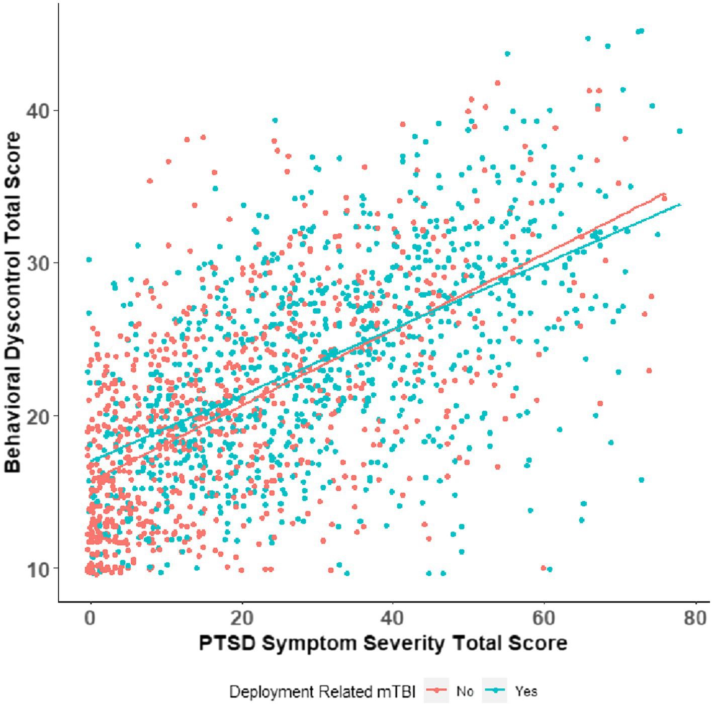 Among the 1,808 individuals in our sample, PTSD symptom severity (B = 0.23, 95% CI: 0.22, 0.25, p < 0.001) and deployment-related mild TBI (B = 3.27, 95% CI: 2.63, 3.90, p < 0.001) were significantly associated with behavioral dyscontrol in univariable analysis. Interaction effects were significant between PTSD symptom severity and deployment mild TBI (B = −0.03, 95% CI: −0.06, −0.01, p = 0.029) in multivariable analysis, indicating that the effect of mild TBI on behavioral dyscontrol is no longer significant among those with a PCL-5 score > 22.96.